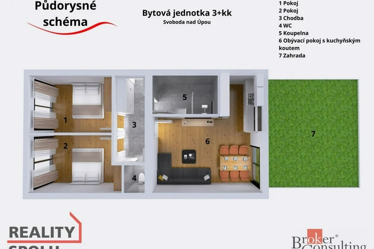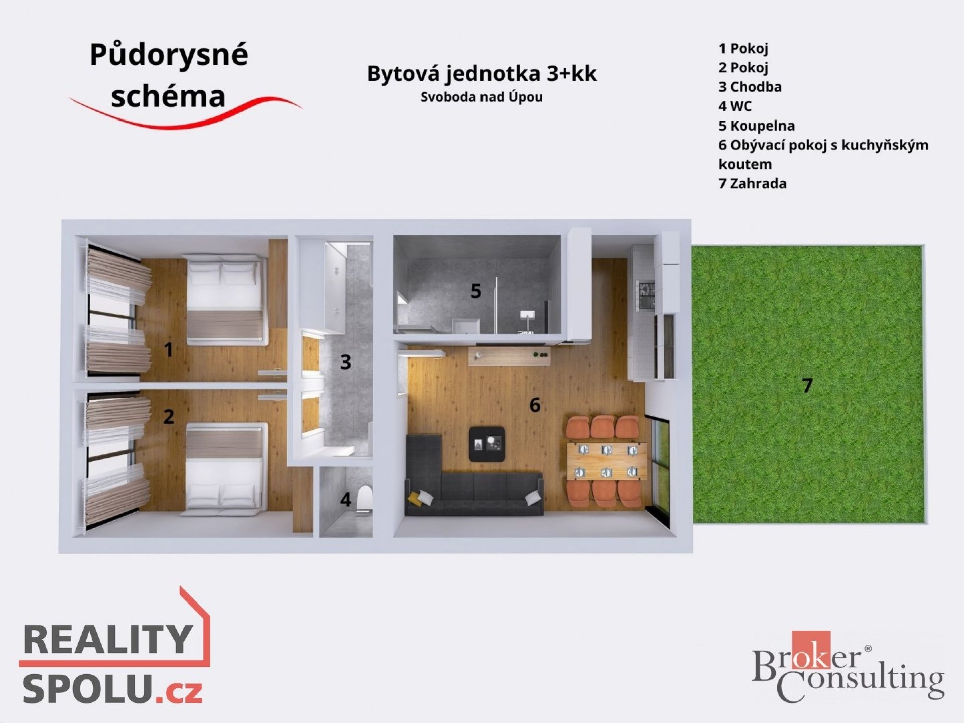 Nabízíme ke koupi ve Svobodě nad Úpou kompletně vybavenou bytovou jednotku (veškerý nábytek a spotřebiče jsou součástí prodeje) 3+KK. K bytu náleží 2 předzahrádky, zděná komora a 2 parkovací stání.