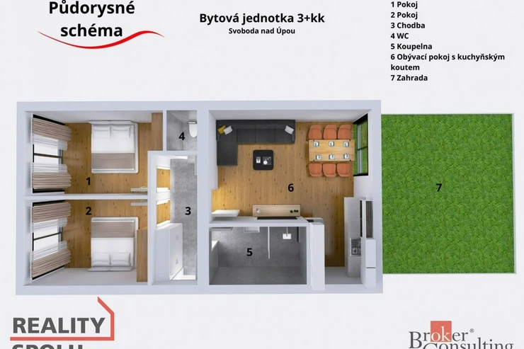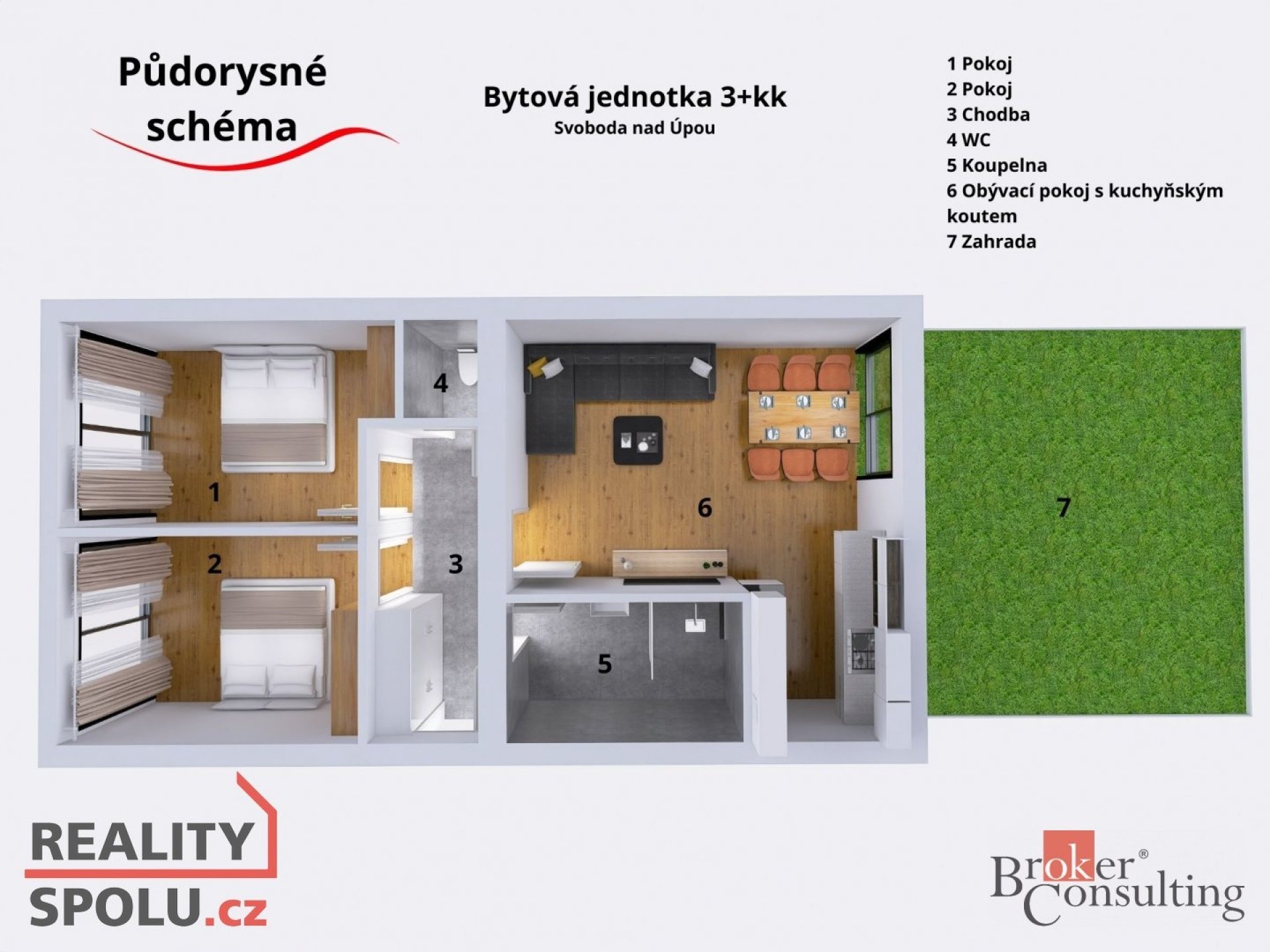 Nabízíme ke koupi ve Svobodě nad Úpou kompletně vybavenou bytovou jednotku (veškerý nábytek a spotřebiče jsou součástí prodeje) 3+KK. K bytu náleží 2 předzahrádky, zděná komora a 3 parkovací stání.