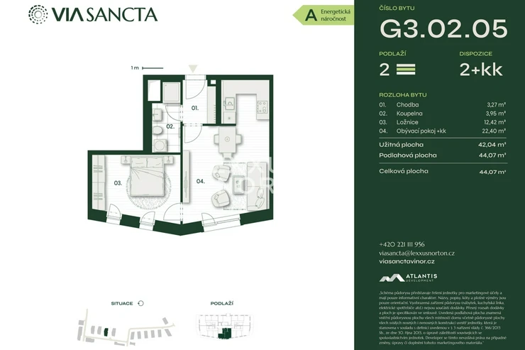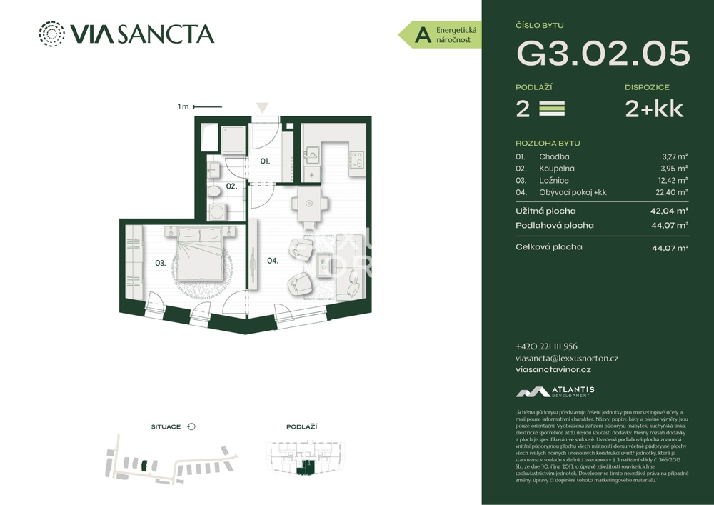 This stylish one-bedroom apartment with an area of 42.04 sqm is located in a quiet part of Prague's Vinor district and offers modern living in a pleasant environment. The biggest benefit is the spacious living area with a kitchenette. The layout also includes an entrance hall with storage space, a bedroom, and a bathroom with a shower. Comfort is complemented by a basement storage unit and the option of garage or outdoor parking.The Via Sancta project represents a new standard of living. It combines modern architecture and cutting-edge technology with an emphasis on sustainability. It offers a wide range of apartments from one-bedroom to spacious three-bedroom, all with a balcony, terrace, or front garden.Modern technologies include heat recovery systems, retention tanks, heat pumps, and preparation for the installation of photovoltaic panels, which together ensure energy efficiency and increase living comfort. In addition, the apartments are equipped with smart home systems that enable efficient energy consumption management and ensure the comfort of residents.Via Sancta is suitable for all generations. The complex is surrounded by greenery with playgrounds and sports facilities. The surrounding area invites active recreation with a golf course and bike path in close proximity to the complex. Commercial spaces directly on the premises provide the necessary services, making Via Sancta an ideal place for modern living.The apartment will be finished to a high standard, including three-layer wooden floors, large-format tiles from Italian brands, Vileroy & Bosh and Grohe bathroom fixtures, security entrance doors, and wood-aluminum windows with insulated triple glazing and preparation for the installation of external blinds. Underfloor heating and cooling maintain the ideal temperature in every room throughout the year. Heat recovery ensures controlled ventilation and fresh air supply. The KNX smart home system allows you to control lighting, blinds, and temperature using smart buttons or a mobile app. Vinor is a quiet and picturesque part of Prague 9, which perfectly combines proximity to nature with urban amenities. It is known for its historical monuments and extensive natural areas, including Vinor Nature Park and Ctenický haj. Complete civic amenities are available for families and individuals, including schools, kindergartens, shops, and sports facilities.Thanks to excellent transport infrastructure, the center of Prague is easily accessible. The journey by car takes about 20 minutes, while regular bus connections will get you to the Letnany metro station in 10 minutes. Vinor is therefore an ideal place for those looking for quiet living with quick access to city amenities.