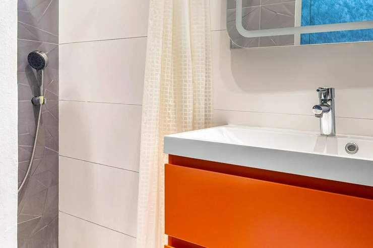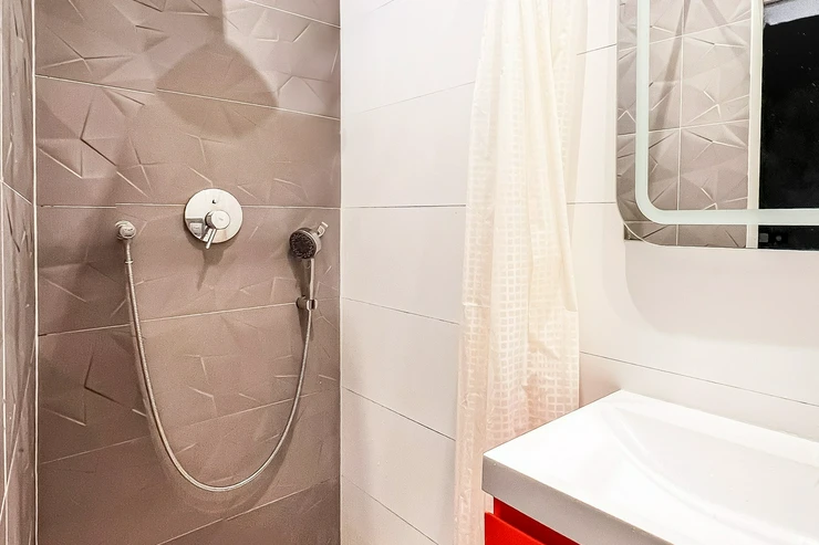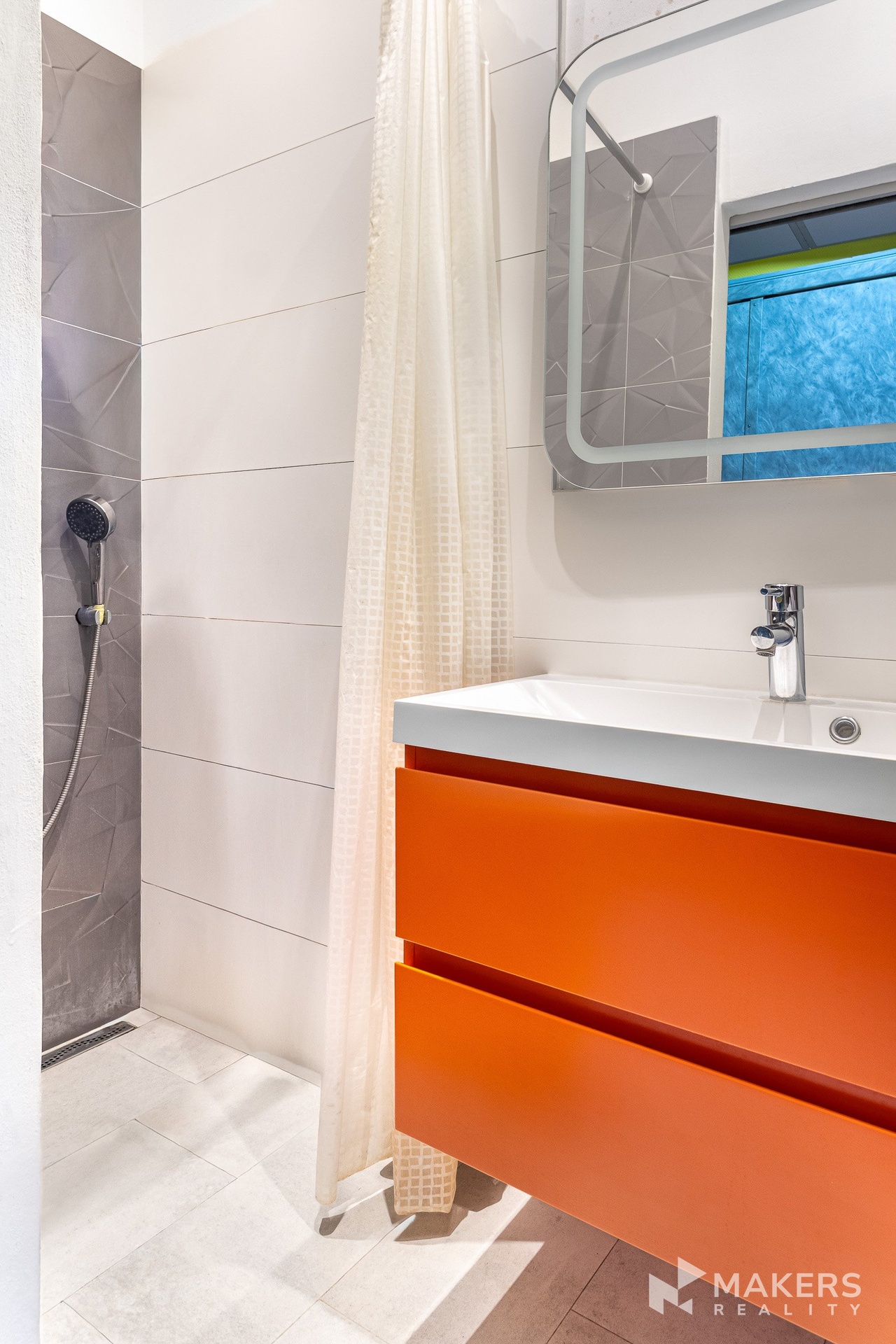 The apartment with a total area of 45 m² offers a functional layout with two separate rooms. The living room is combined with a kitchenette and features a southeast orientation with a view directly of the iconic Žižkov Television Tower. The second room has a northeast orientation with a view of Parukářka Park. The apartment includes a modern bathroom with a shower cabin and a separate toilet. The apartment also includes a practical storage space (cellar/sklep).
