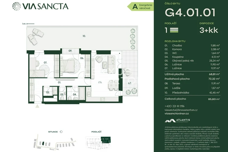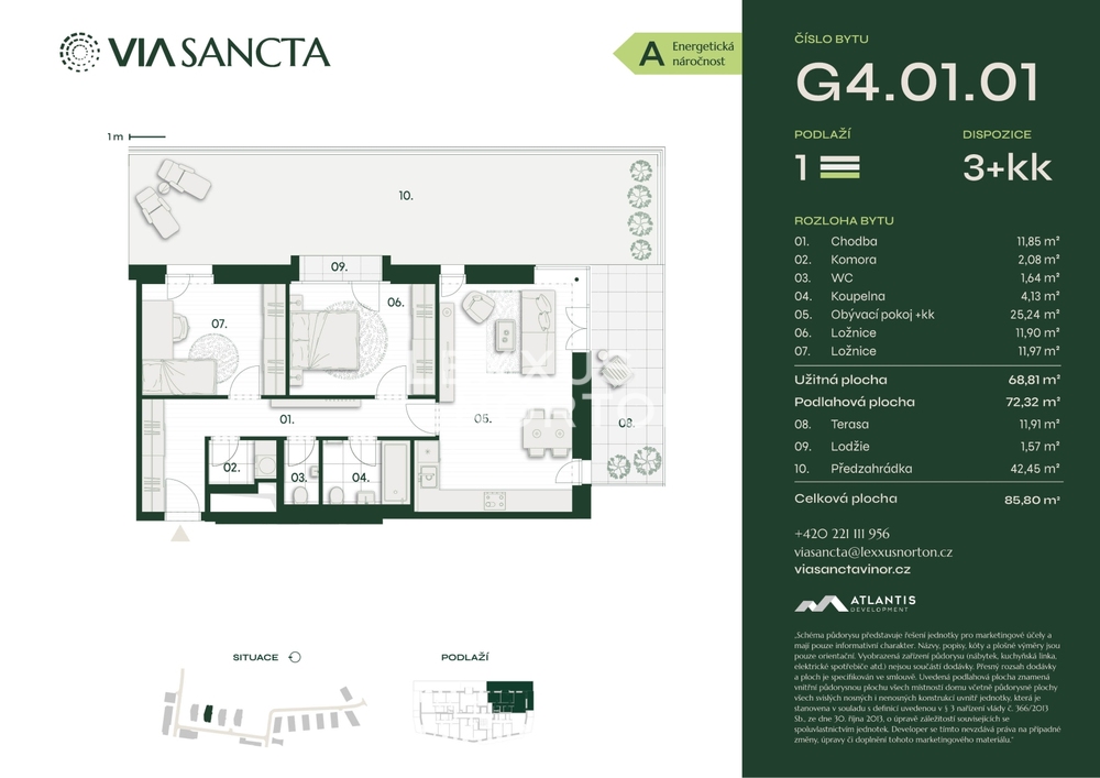 The main benefit of this 72.32 sqm two-bedroom apartment is the combination of a spacious terrace 11.91 m² and a 42.45 sqm front garden, which provides plenty of privacy and space to relax. The living room with kitchenette is the natural center of the apartment and allows direct access to the terrace. The entrance hall offers plenty of space for storage, a pantry, a bathroom with a bathtub, and a separate toilet. The apartment comes with a basement storage unit and the option of outdoor or garage parking.The Via Sancta project represents a new standard of living. It combines modern architecture and cutting-edge technology with an emphasis on sustainability. It offers a wide range of apartments from one-bedroom to spacious three-bedroom, all with a balcony, terrace, or front garden.Modern technologies include heat recovery systems, retention tanks, heat pumps, and preparation for the installation of photovoltaic panels, which together ensure energy efficiency and increase living comfort. In addition, the apartments are equipped with smart home systems that enable efficient energy consumption management and ensure the comfort of residents.Via Sancta is suitable for all generations. The complex is surrounded by greenery with playgrounds and sports facilities. The surrounding area invites active recreation with a golf course and bike path in close proximity to the complex. Commercial spaces directly on the premises provide the necessary services, making Via Sancta an ideal place for modern living.The apartment will be finished to a high standard, including three-layer wooden floors, large-format tiles from Italian brands, Vileroy & Bosh and Grohe bathroom fixtures, security entrance doors, and wood-aluminum windows with insulated triple glazing and preparation for the installation of external blinds. Underfloor heating and cooling maintain the ideal temperature in every room throughout the year. Heat recovery ensures controlled ventilation and fresh air supply. The KNX smart home system allows you to control lighting, blinds.Vinor is a quiet and picturesque part of Prague 9, which perfectly combines proximity to nature with urban amenities. It is known for its historical monuments and extensive natural areas, including Vinor Nature Park and Ctenický haj. Complete civic amenities are available for families and individuals, including schools, kindergartens, shops, and sports facilities.Thanks to excellent transport infrastructure, the center of Prague is easily accessible. The journey by car takes about 20 minutes, while regular bus connections will get you to the Letnany metro station in 10 minutes. Vinor is therefore an ideal place for those looking for quiet living with quick access to city amenities.