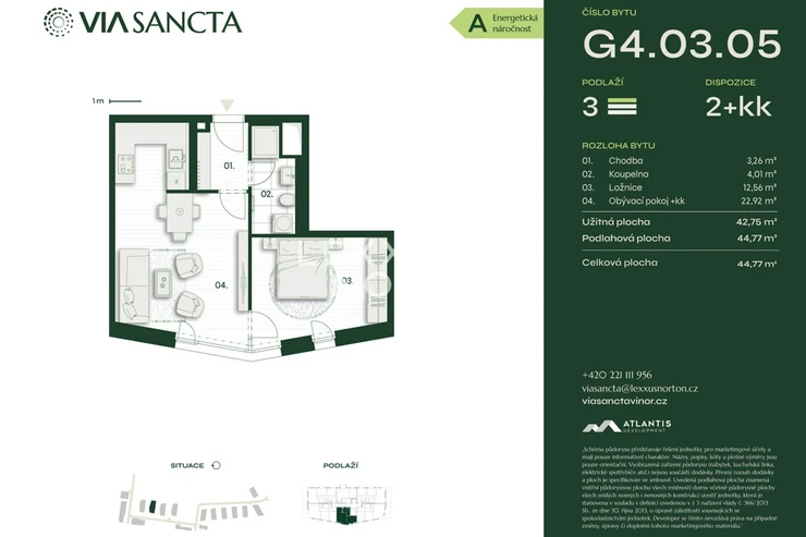 This stylish one-bedroom apartment with an area of 44.77 sqm is located in a quiet part of Prague's Vinor district and offers modern living in a pleasant environment. The biggest benefit is the spacious living area with a kitchenette. The layout also includes an entrance hall with storage space, a bedroom, and a bathroom with a shower. Comfort is complemented by a basement storage unit and the option of garage or outdoor parking.The Via Sancta project represents a new standard of living. It combines modern architecture and cutting-edge technology with an emphasis on sustainability. It offers a wide range of apartments from one-bedroom to spacious three-bedroom, all with a balcony, terrace, or front garden.Modern technologies include heat recovery systems, retention tanks, heat pumps, and preparation for the installation of photovoltaic panels, which together ensure energy efficiency and increase living comfort. In addition, the apartments are equipped with smart home systems that enable efficient energy consumption management and ensure the comfort of residents.Via Sancta is suitable for all generations. The complex is surrounded by greenery with playgrounds and sports facilities. The surrounding area invites active recreation with a golf course and bike path in close proximity to the complex. Commercial spaces directly on the premises provide the necessary services, making Via Sancta an ideal place for modern living.The apartment will be finished to a high standard, including three-layer wooden floors, large-format tiles from Italian brands, Vileroy & Bosh and Grohe bathroom fixtures, security entrance doors, and wood-aluminum windows with insulated triple glazing and preparation for the installation of external blinds. Underfloor heating and cooling maintain the ideal temperature in every room throughout the year. Heat recovery ensures controlled ventilation and fresh air supply. The KNX smart home system allows you to control lighting, blinds, and temperature using smart buttons or a mobile app. Vinor is a quiet and picturesque part of Prague 9, which perfectly combines proximity to nature with urban amenities. It is known for its historical monuments and extensive natural areas, including Vinor Nature Park and Ctenický haj. Complete civic amenities are available for families and individuals, including schools, kindergartens, shops, and sports facilities.Thanks to excellent transport infrastructure, the center of Prague is easily accessible. The journey by car takes about 20 minutes, while regular bus connections will get you to the Letnany metro station in 10 minutes. Vinor is therefore an ideal place for those looking for quiet living with quick access to city amenities.
