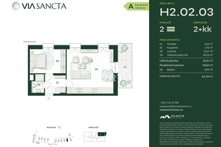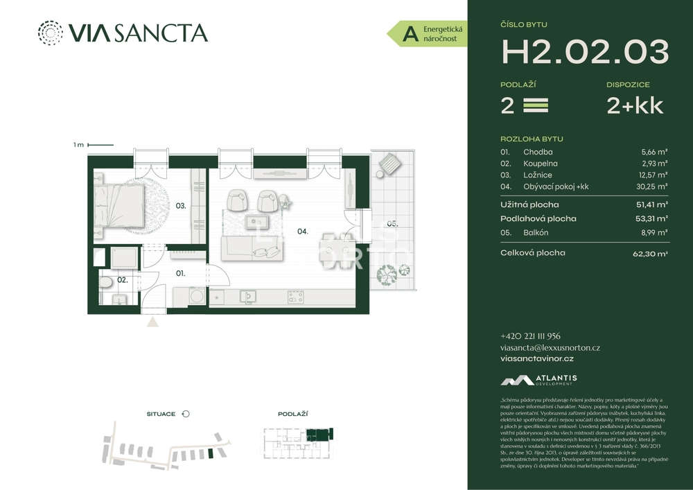 This stylish one-bedroom apartment with an area of 53.31 sqm is located in a quiet part of Prague's Vinor district and offers modern living in a pleasant environment. The biggest benefit is the spacious living area with a kitchenette and direct access to a south-facing balcony measuring 8.99 sqm, which provides an ideal place to relax. The layout also includes an entrance hall with storage space, a bedroom, and a bathroom with a shower. Comfort is complemented by a basement storage unit and the option of garage or outdoor parking.The Via Sancta project represents a new standard of living. It combines modern architecture and cutting-edge technology with an emphasis on sustainability. It offers a wide range of apartments from one-bedroom to spacious three-bedroom, all with a balcony, terrace, or front garden.Modern technologies include heat recovery systems, retention tanks, heat pumps, and preparation for the installation of photovoltaic panels, which together ensure energy efficiency and increase living comfort. In addition, the apartments are equipped with smart home systems that enable efficient energy consumption management and ensure the comfort of residents.Via Sancta is suitable for all generations. The complex is surrounded by greenery with playgrounds and sports facilities. The surrounding area invites active recreation with a golf course and bike path in close proximity to the complex. Commercial spaces directly on the premises provide the necessary services, making Via Sancta an ideal place for modern living.The apartment will be finished to a high standard, including three-layer wooden floors, large-format tiles from Italian brands, Vileroy & Bosh and Grohe bathroom fixtures, security entrance doors, and wood-aluminum windows with insulated triple glazing and preparation for the installation of external blinds. Underfloor heating and cooling maintain the ideal temperature in every room throughout the year. Heat recovery ensures controlled ventilation and fresh air supply. The KNX smart home system allows you to control lighting, blinds.Vinor is a quiet and picturesque part of Prague 9, which perfectly combines proximity to nature with urban amenities. It is known for its historical monuments and extensive natural areas, including Vinor Nature Park and Ctenický haj. Complete civic amenities are available for families and individuals, including schools, kindergartens, shops, and sports facilities.Thanks to excellent transport infrastructure, the center of Prague is easily accessible. The journey by car takes about 20 minutes, while regular bus connections will get you to the Letnany metro station in 10 minutes. Vinor is therefore an ideal place for those looking for quiet living with quick access to city amenities.