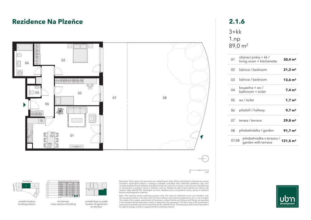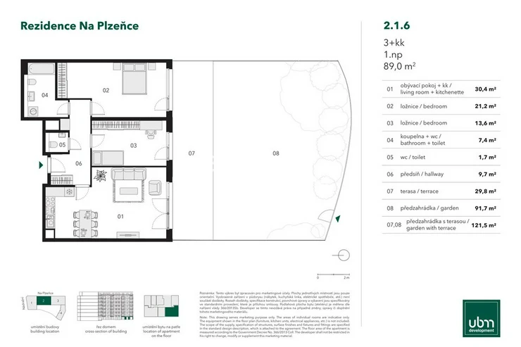 This spacious 89 sqm two-bedroom apartment is located on the ground floor and offers comfortable and practical living with direct access to a large terrace and garden. The approximately 30 sqm terrace and 92.7 sqm garden create the ideal space for outdoor activities, barbecues, or relaxing in the fresh air. Thanks to its south-facing orientation, the apartment is very bright, sunny, and pleasantly lit throughout the day. This apartment is suitable for families or individuals looking to combine comfortable living with a large outdoor space right next to the house. The Na Plzence Residence is a modern and ecological residential project in the dynamically developing Smíchov district. It offers 160 apartments with layouts from 1 to 4 bedrooms, high–standard fittings, and class-A energy efficiency (EPC). The project uses geothermal boreholes, heat pumps, and photovoltaic panels, which reduce operating costs and provide efficient heating and cooling. The residence includes a private courtyard with green space, a two-storey underground garage with charging stations for electric vehicles, and facilities for cyclists.Housing in the Na Plzence Residence combines modern style, energy efficiency and excellent accessibility in the dynamically developing district of Smichov. Construction is already underway, with completion scheduled for the year 2027.Large-format windows with wooden frames and triple glazing bring in plenty of daylight while providing excellent thermal insulation.The apartment has wooden floors and underfloor heating, which provide a comfortable temperature in any season and can replace air conditioning.Smichov is one of Prague's fastest-developing districts and will undergo a significant transformation in the coming years. As part of the revitalisation of the area around the Smichov railway station, a new transport terminal will be built to connect the metro, train station, tram and bus lines with a large P+R car park. At the same time, the railway station is being rebuilt, and a new urban district with offices, shops and public spaces will be created in the area.The Residence is within walking distance of the Smichov railway station, line B metro and tram lines, providing excellent transport accessibility. The proximity to the Vltava River and the Smichov Embankment gives the location an unmistakable atmosphere that combines an urban lifestyle with a pleasant environment for everyday life. There is a wide range of restaurants, cafes, shops, pharmacies and medical facilities in the area.