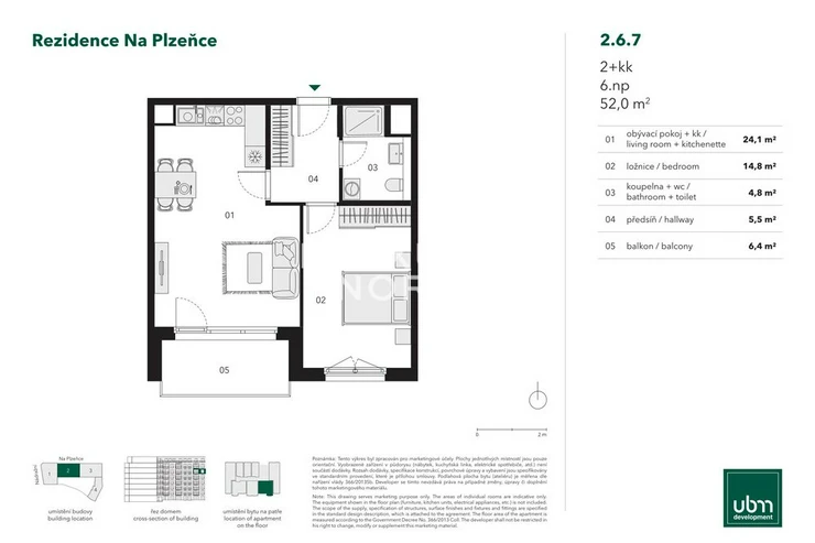 A modern one-room apartment with a total area of 52 sqm is located on the 6th floor and offers a practical layout for comfortable living. The apartment includes a 6.4 sqm balcony, ideal for sitting or relaxing outdoors. Thanks to its south-facing orientation, the apartment is very bright and receives plenty of daylight throughout the day, creating a pleasant atmosphere. Its layout makes it suitable for singles or couples seeking comfort with good transport links to the city center.The Na Plzence Residence is a modern and ecological residential project in the dynamically developing Smichov district. It offers 160 apartments with layouts from 1 to 4 bedrooms, high–standard fittings, and class-A energy efficiency (EPC). The project uses geothermal boreholes, heat pumps, and photovoltaic panels, which reduce operating costs and provide efficient heating and cooling. The residence includes also a private courtyard with green space.Housing in the Na Plzence Residence combines modern style, energy efficiency and excellent accessibility in the dynamically developing district of Smichov.Construction is already underway, with completion scheduled for the year 2027.Large-format windows with wooden frames and triple glazing bring in plenty of daylight while providing excellent thermal insulation.The apartment has wooden floors and underfloor heating, which provide a comfortable temperature in any season and can replace air conditioning.Smichov is one of Prague's fastest-developing districts and will undergo a significant transformation in the coming years. As part of the revitalisation of the area around the Smichov railway station, a new transport terminal will be built to connect the metro, train station, tram and bus lines with a large P+R car park. At the same time, the railway station is being rebuilt, and a new urban district with offices, shops and public spaces will be created in the area.The Residence is within walking distance of the Smichov railway station, line B metro and tram lines, providing excellent transport accessibility. The proximity to the Vltava River and the Smichov Embankment gives the location an unmistakable atmosphere that combines an urban lifestyle with a pleasant environment for everyday life. There is a wide range of restaurants, cafes, shops, pharmacies and medical facilities in the area.