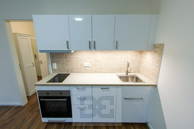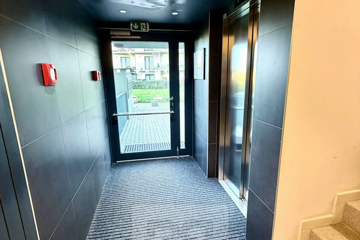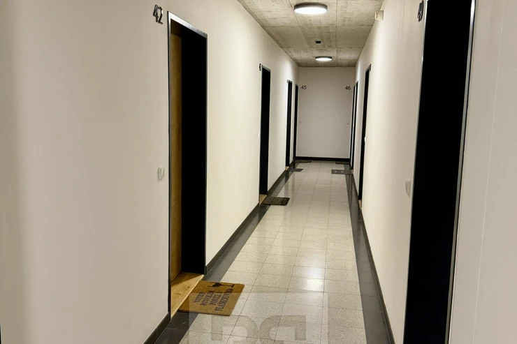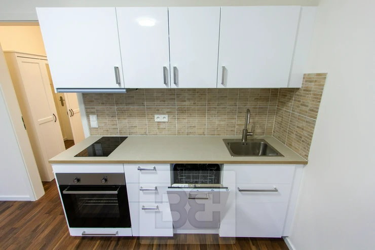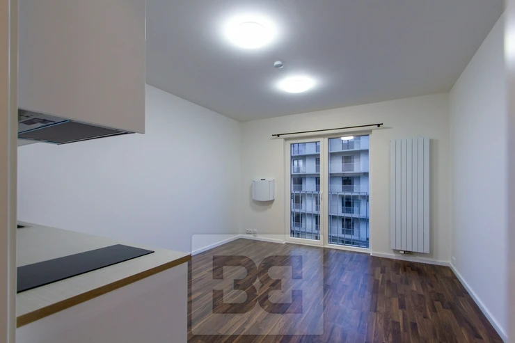 The unit consists of an entrance hall with space for a wardrobe, a bathroom with a shower, toilet and sink, and a main living room with a kitchenette equipped with a built-in dishwasher, hob, and oven. A pleasant indoor climate is ensured by a recuperation system, which provides constant fresh air without the need for opening windows.