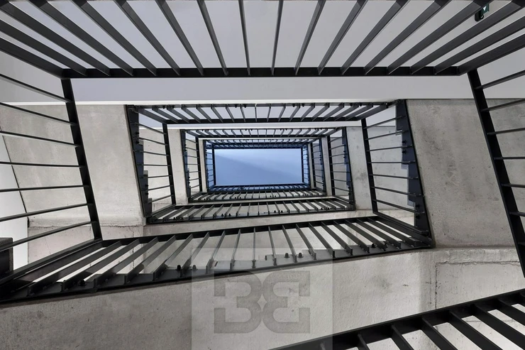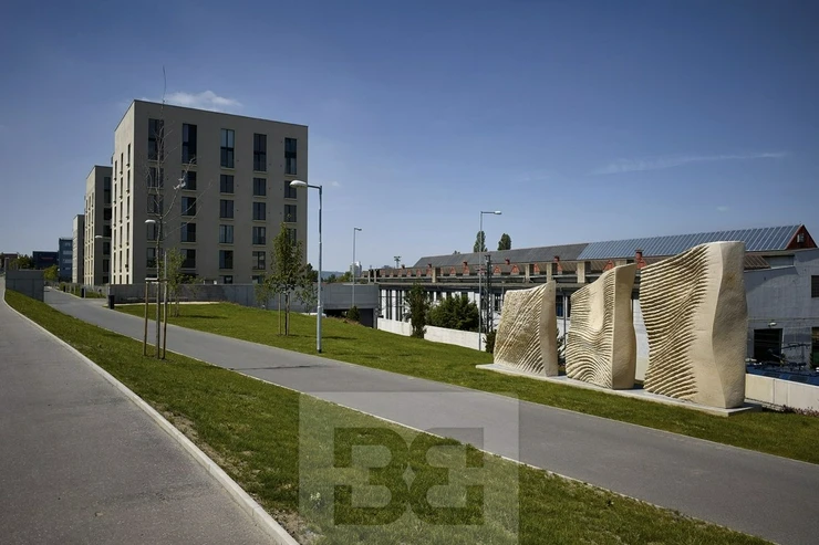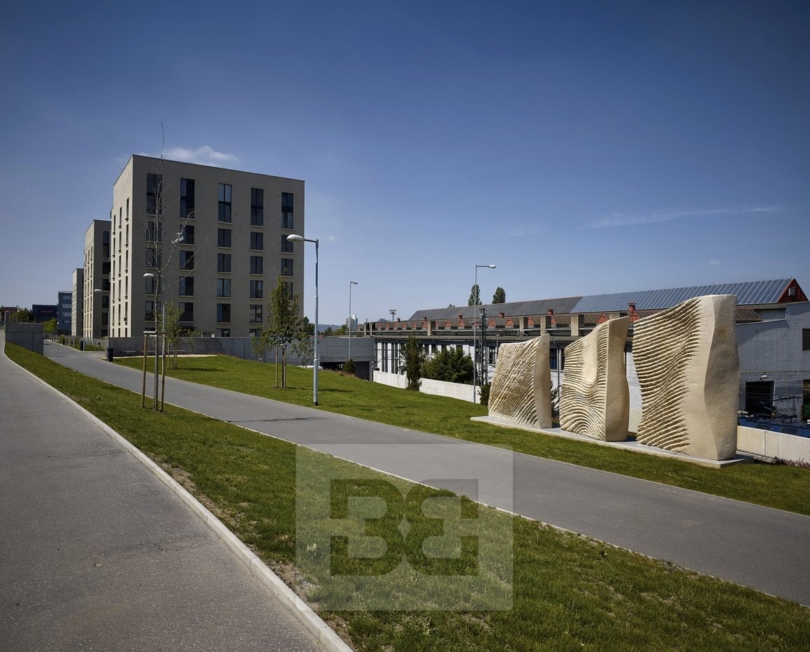 They sit one level below the street, creating a pleasant public space surrounded by greenery, dominated by an abstract sandstone sculpture by sculptor Petr Váňa, inspired by the flowing forms of three female figures.