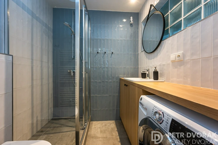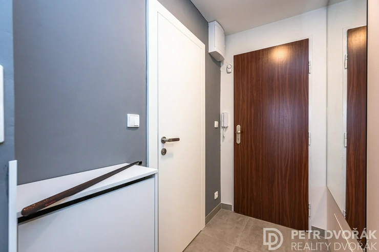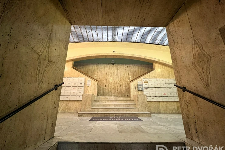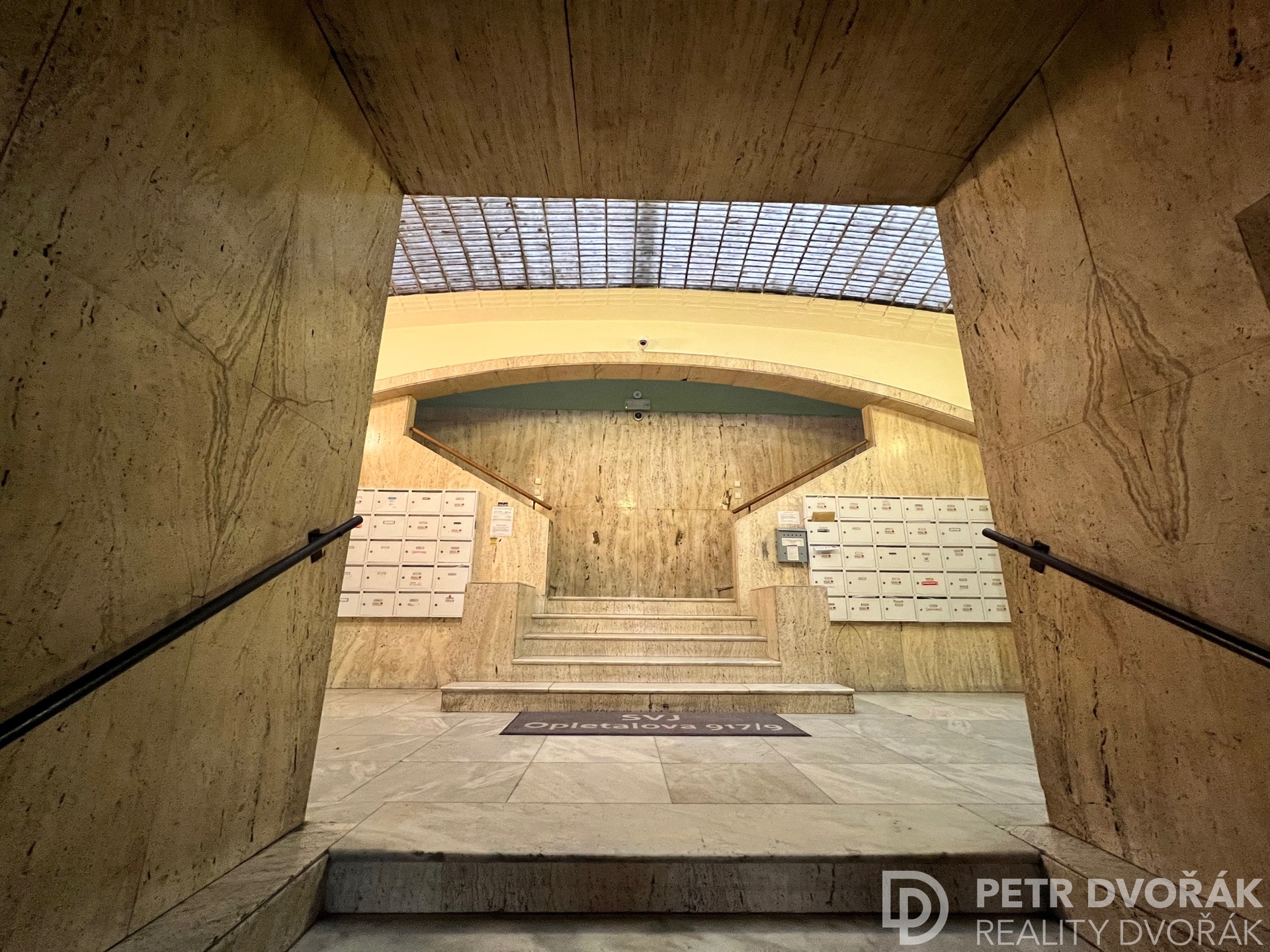 This modern, tastefully renovated studio apartment with a terrace facing a quiet courtyard is located in a functionalist residential building on Opletalova Street, designed by architect Ferdinand Fencl and completed in 1939. The building features two elevators and elegant common areas.