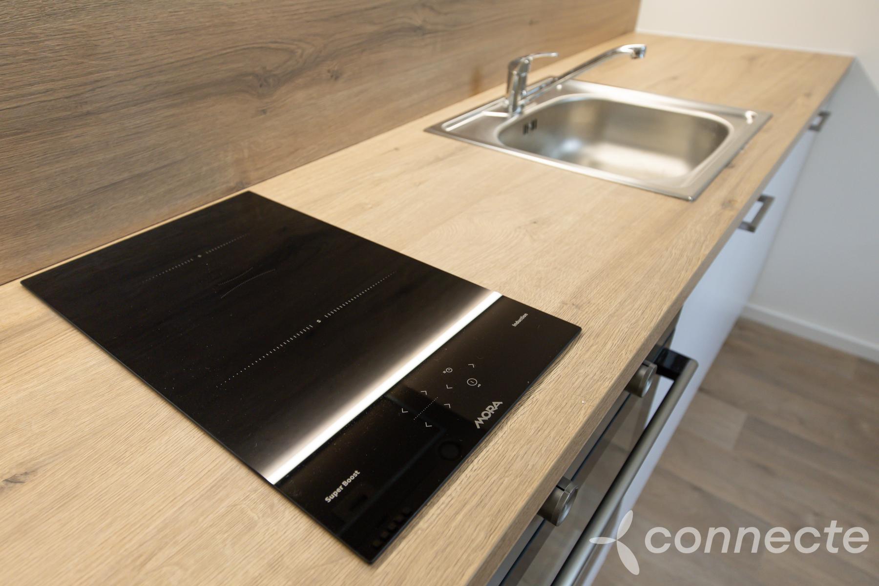 Fitted kitchen with Mora appliances, tailored to the project, including washing machine connections