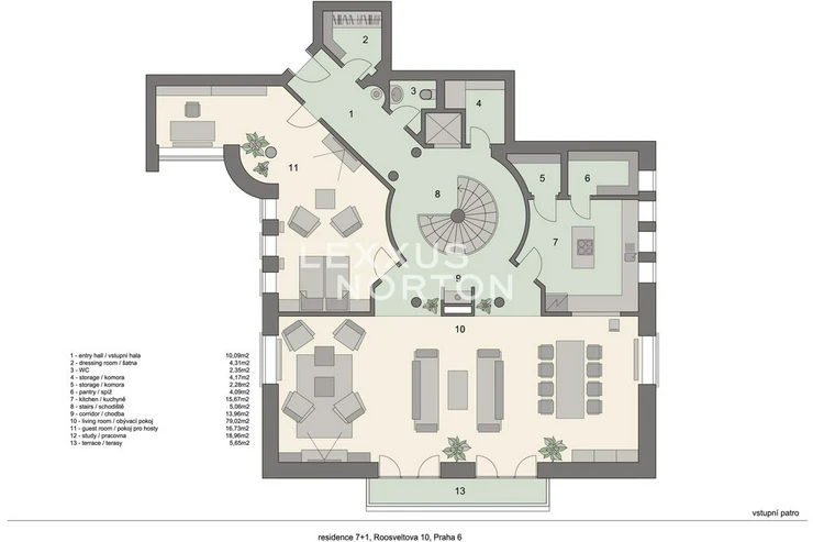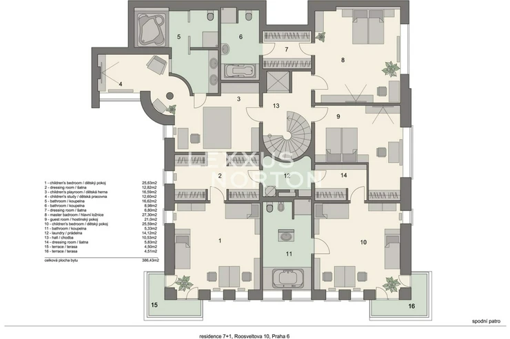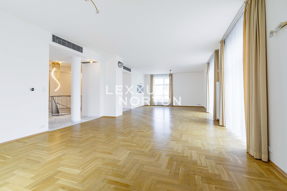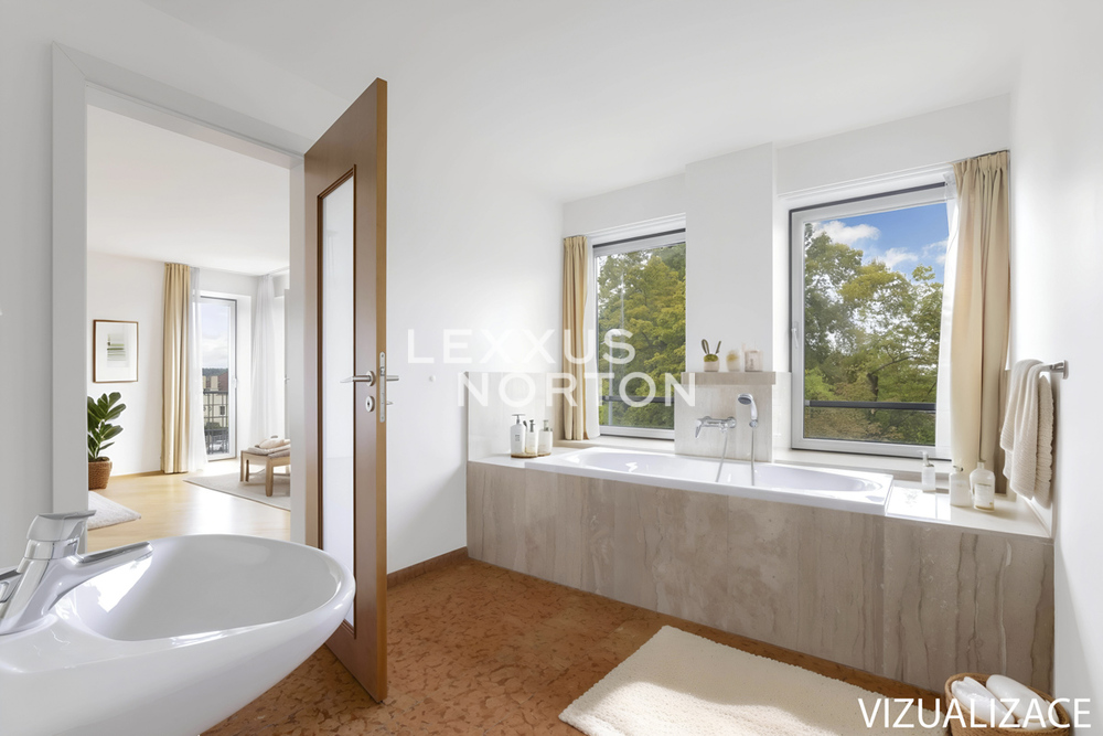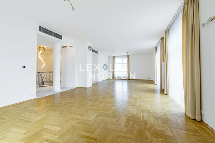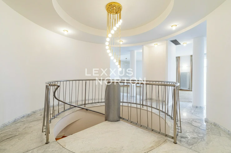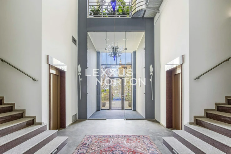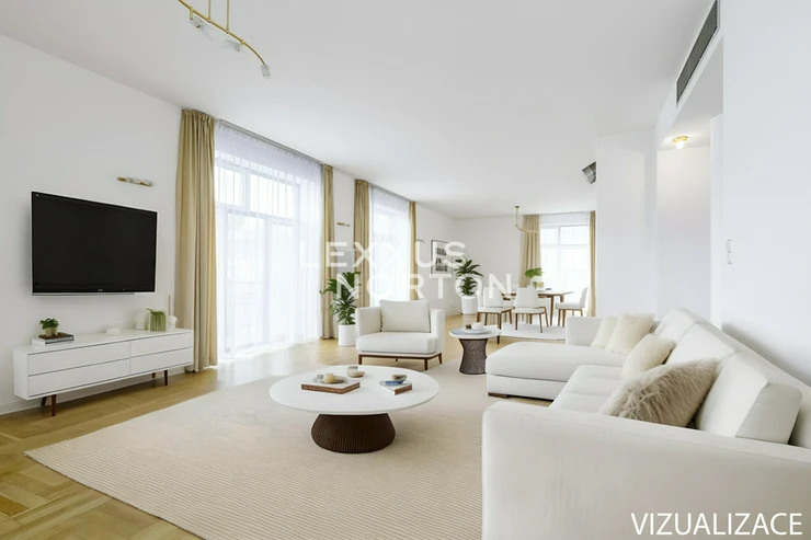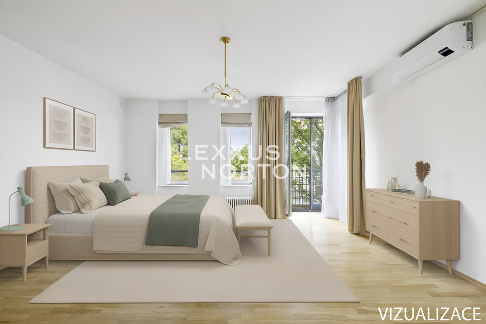 We offer for sale an exceptional six-bedroom duplex apartment, which spans the second and third floors of a modern residence with an elevator, swimming pool, sauna, fitness center, and a well-maintained ornamental garden. The size of the apartment is comparable to the built-up area of the house, offering exceptional facilities. The residence is located in the prestigious area of Prague 6 – Bubenec, in a quiet and sought-after diplomatic district, just a few steps from Stromovka Park.The entrance floor of the apartment features a spacious social area with a living room of almost 80 sqm, facing east with a regular rectangular layout, giving it a representative character. There is also a separate kitchen with a pantry, a guest room, an office, and a separate toilet. Comfort is enhanced by a large number of storage spaces in the form of utility rooms.The lower floor is designed as a quiet and private zone. It includes five bedrooms, two of which have direct access to their own terrace. Three bedrooms have their own bathrooms, with the bedrooms and bathrooms connected via dressing rooms. This layout ensures maximum comfort and privacy, and the practical facilities of the lower floor also include a utility room for household tasks.The apartment has three balconies, providing pleasant outdoor seating. Included in the purchase price are three large garage spaces and a cellar, with all areas conveniently accessible by elevator.The sought-after Prague district, with its unique atmosphere, is located near foreign embassies. The area offers excellent transport accessibility. Just a few minutes’ walk to metro Dejvicka and a tram stop with quick connections to the city center. Nearby are quality schools and kindergartens, including international schools such as Riverside School Prague and ISP. For leisure activities, the area offers a sports center, tennis courts, and a workout park. Within reach are parks such as Stromovka, Willy Brandt, and Lázaro Cárdenas, or you can walk along the Vltava River. Thanks to good road connections, a convenient route to Vaclav Havel Airport is also ensured.