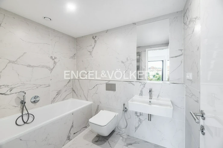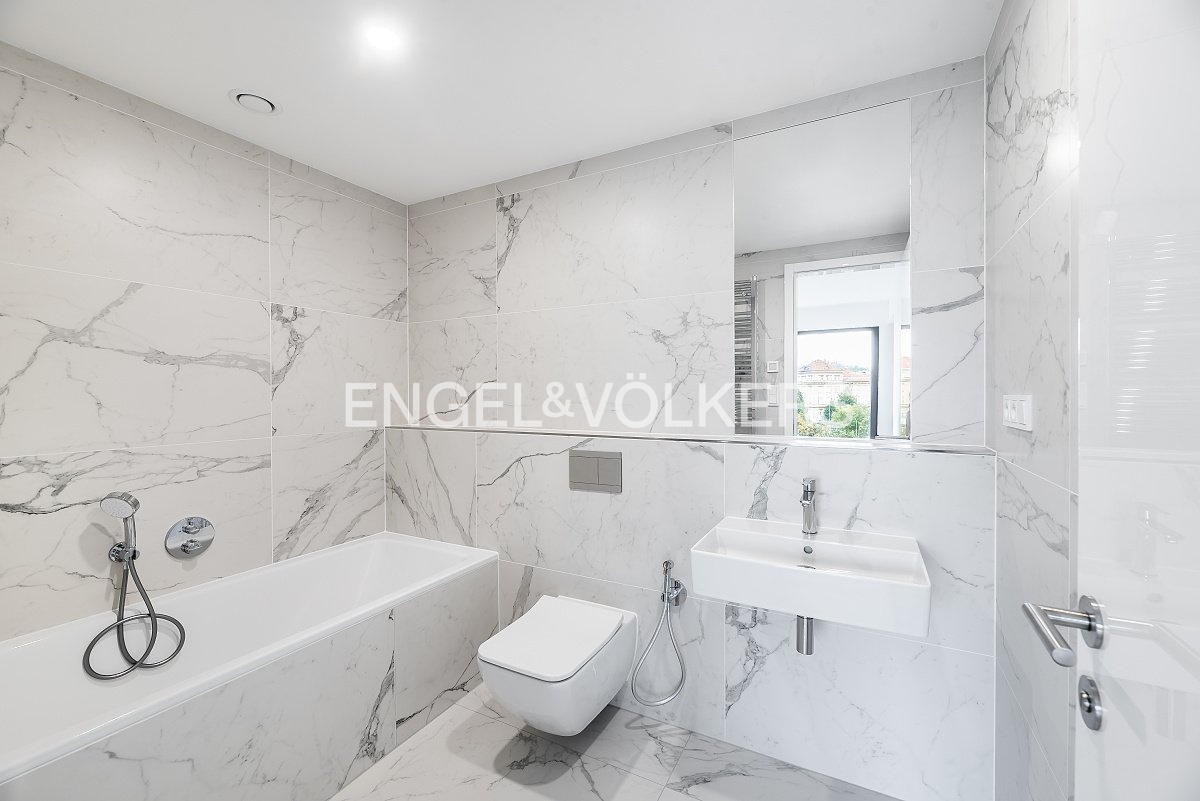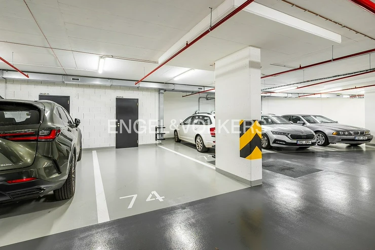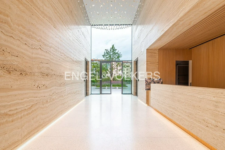 The standard of the apartment meets the latest requirements for quality urban living – three-layer oak flooring, large-format ceramic tiles, aluminium windows with insulated triple glazing and external blinds, underfloor heating, and central air recovery. The building has an energy class B and features a 24/7 reception, representative common areas, and a landscaped courtyard with greenery and a fountain.