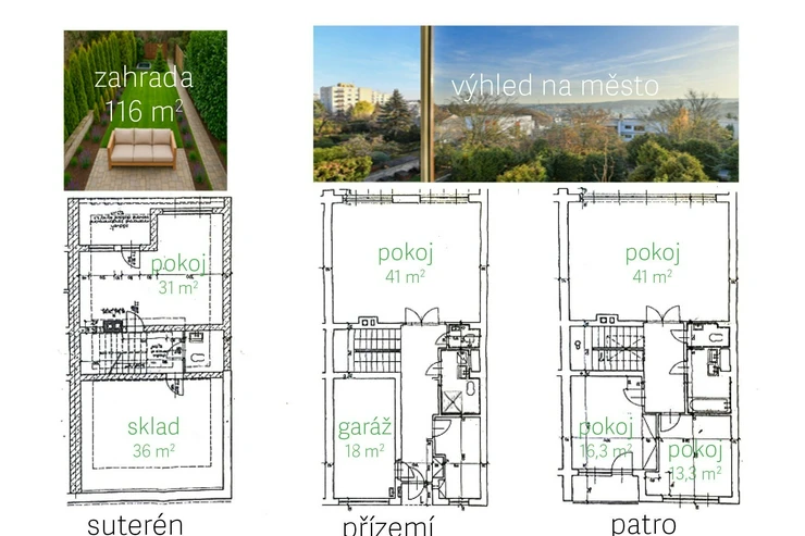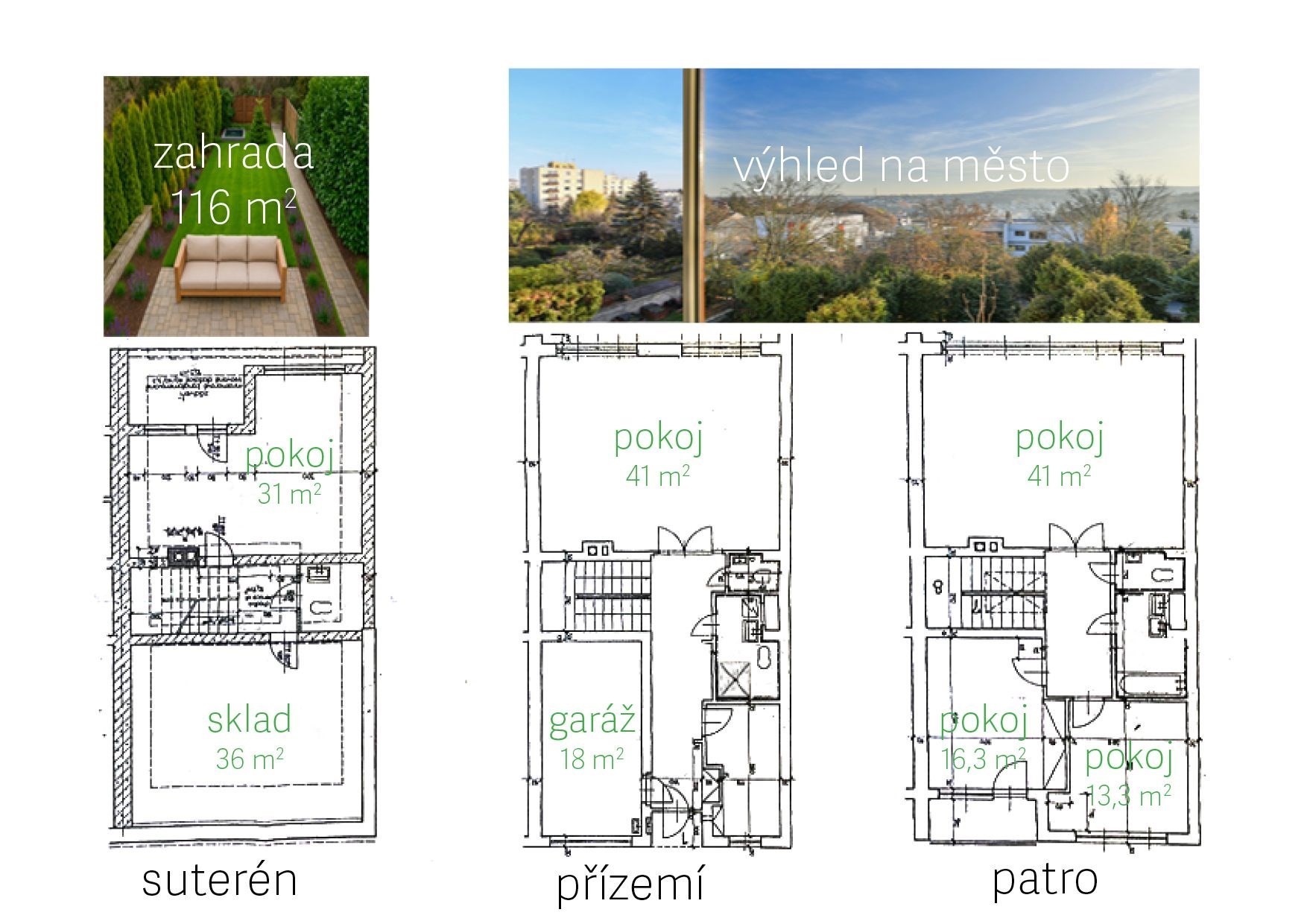 The upper floor has three bedrooms (41 m², 16,3m² and 13,3 m²), another bathroom and toilet, while the lower floor features a room 31 m² with a second kitchen that opens to the garden 116 m² and a spacious storage area 36 m².