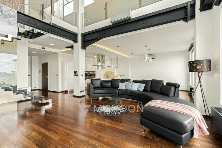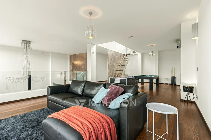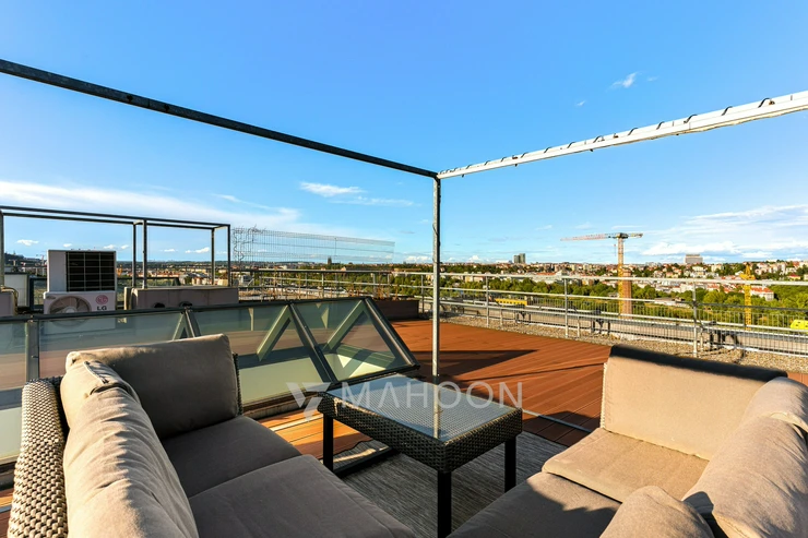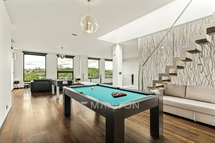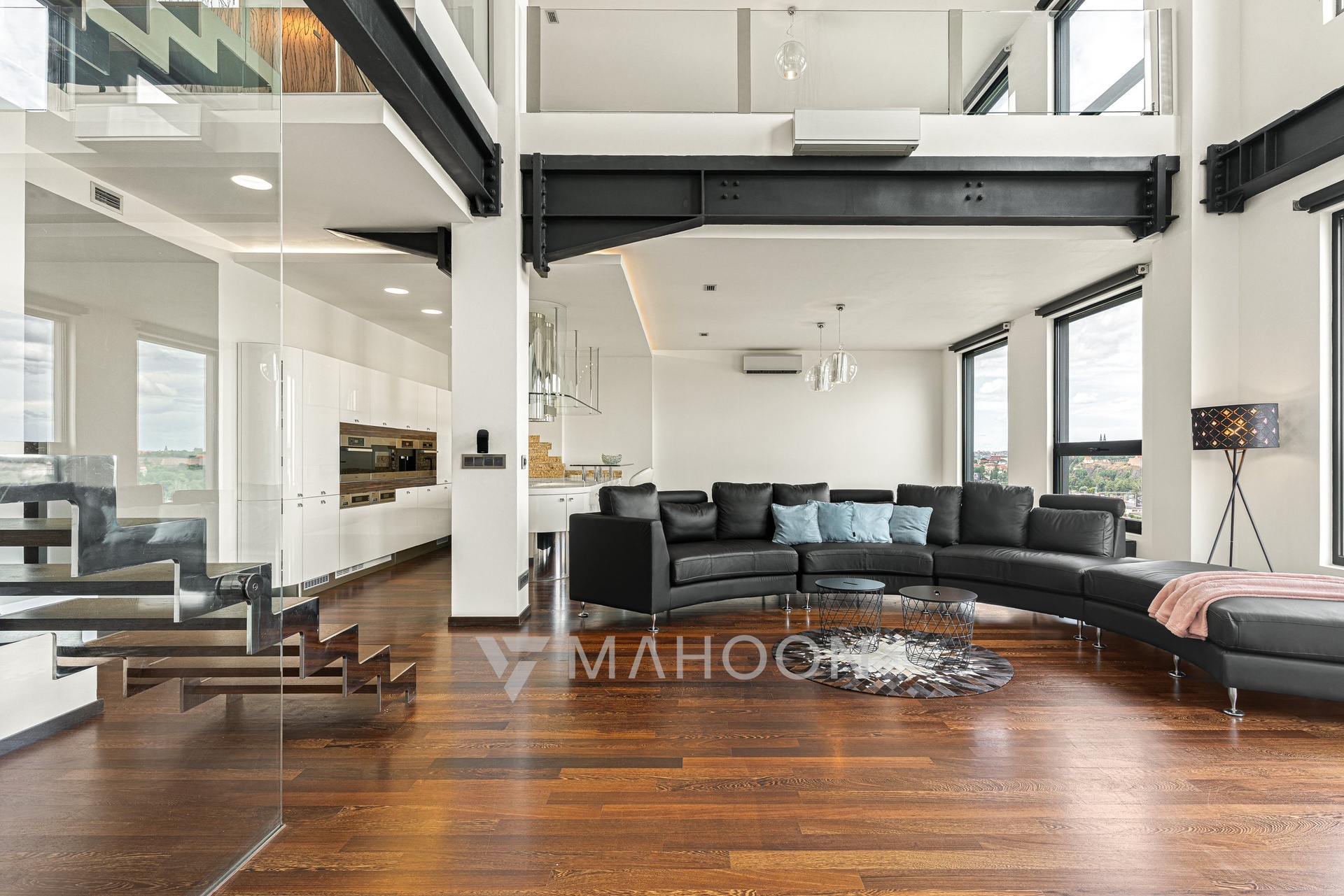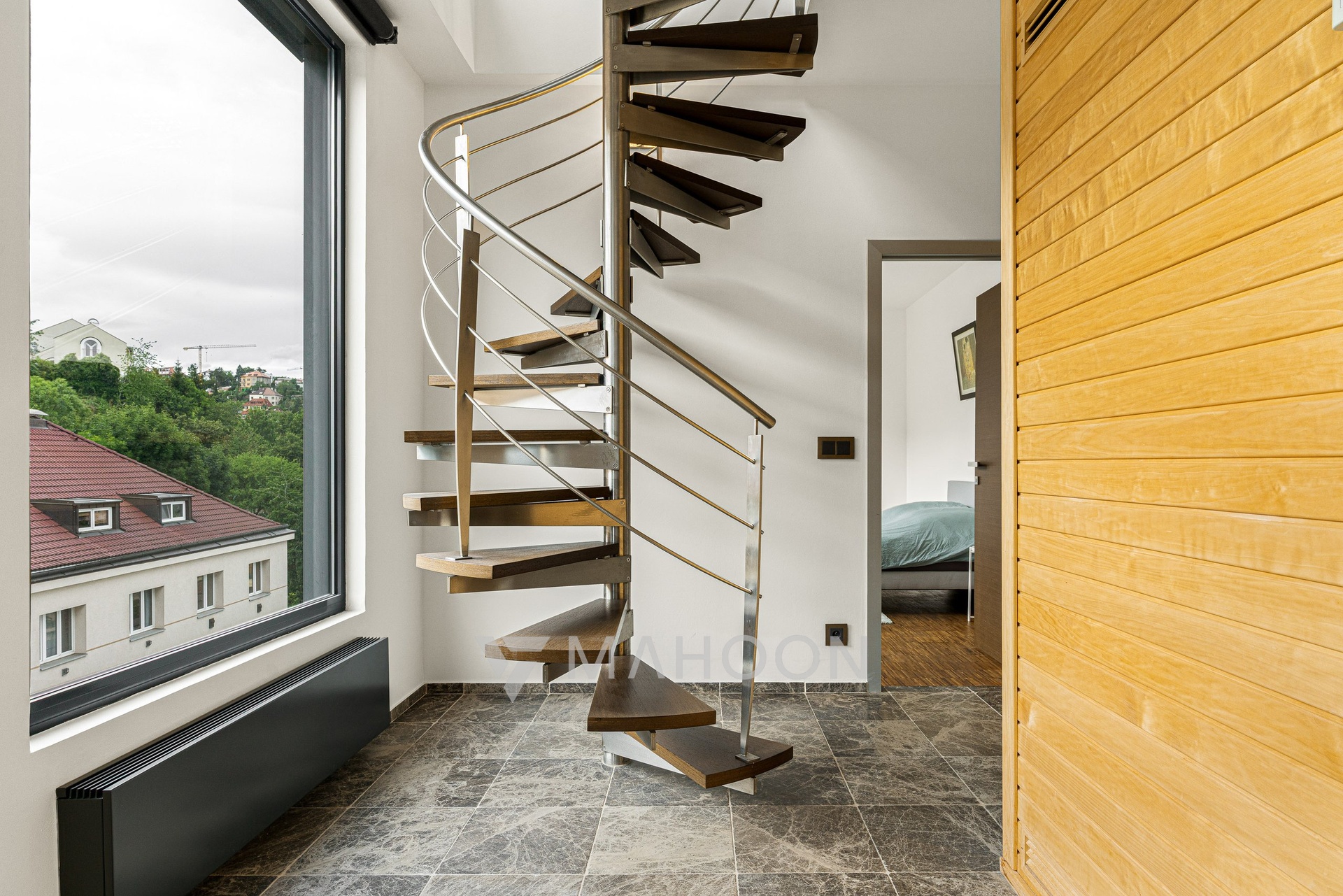 The studio offers a generous layout of 3+kk, two separate entrances, a sauna, a bathroom with a jacuzzi and a roof terrace with automatic irrigation. The interior is designed with an emphasis on detail - from solid wooden floors, mosaics and marble, to distinctive design elements.