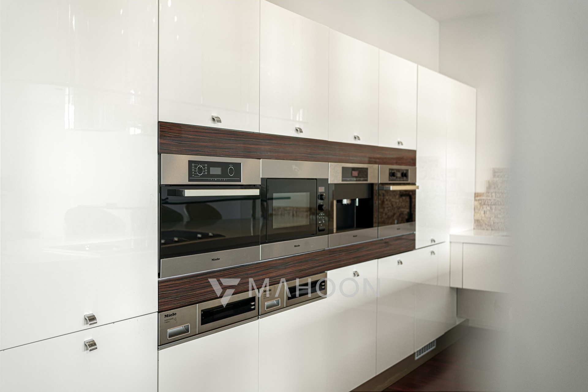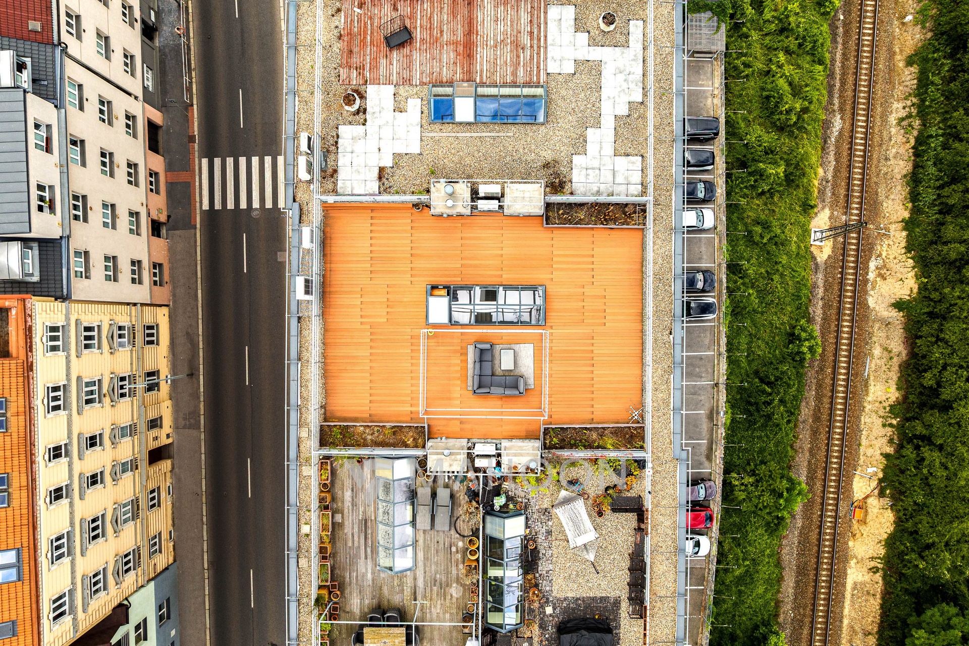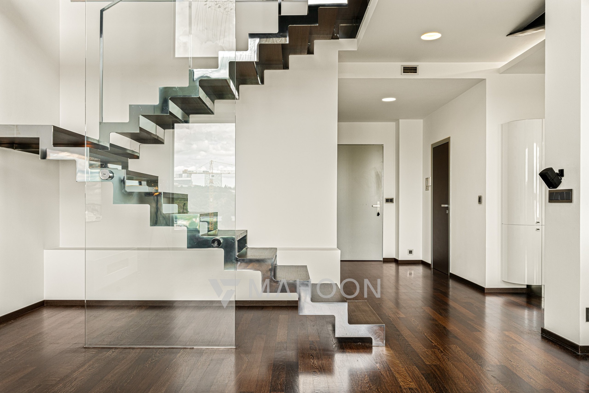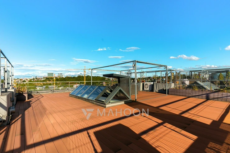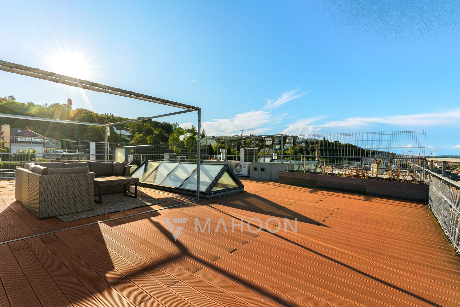 The studio offers a generous layout of 3+kk, two separate entrances, a sauna, a bathroom with a jacuzzi and a roof terrace with automatic irrigation. The interior is designed with an emphasis on detail - from solid wooden floors, mosaics and marble, to distinctive design elements.