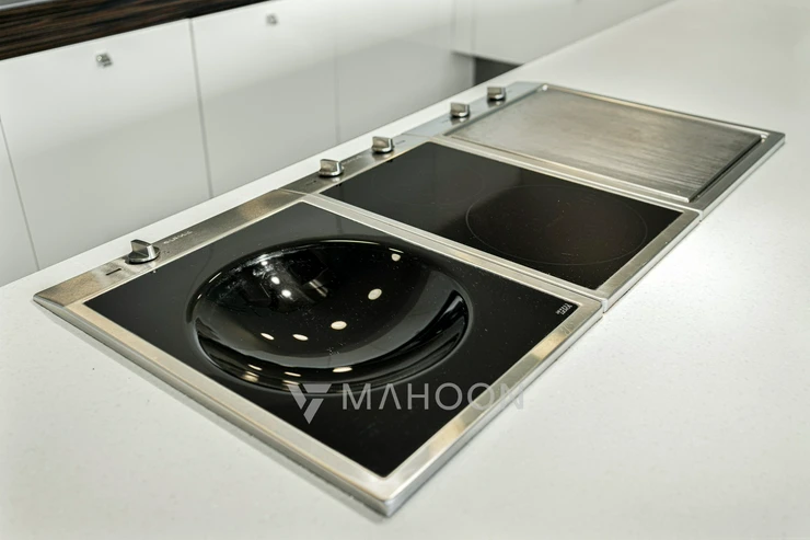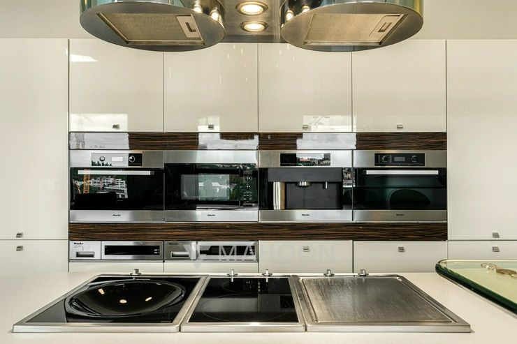 The equipment includes a custom-made kitchen with Miele appliances, an air conditioning unit, electric shading, armored entrance doors and built-in storage spaces.