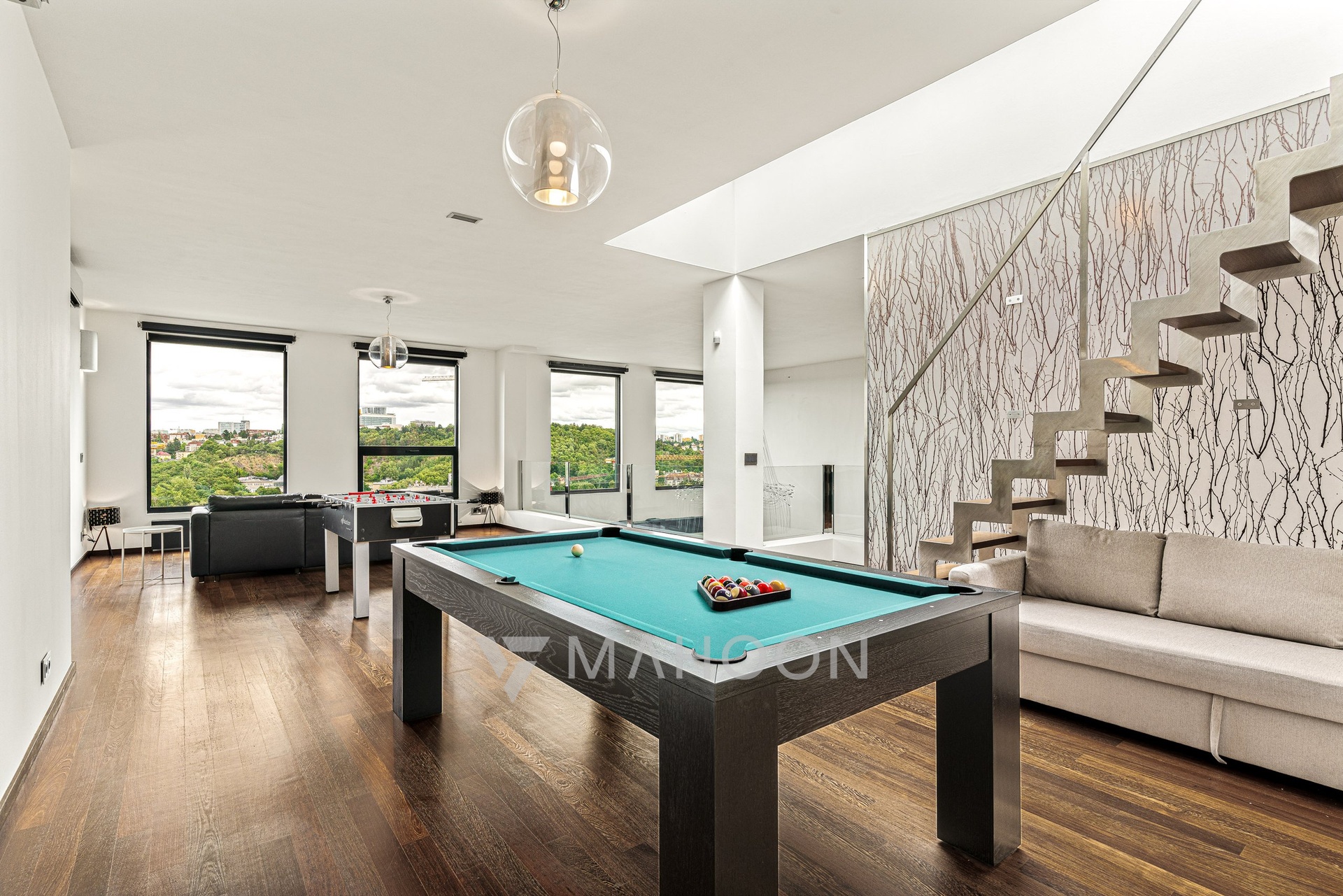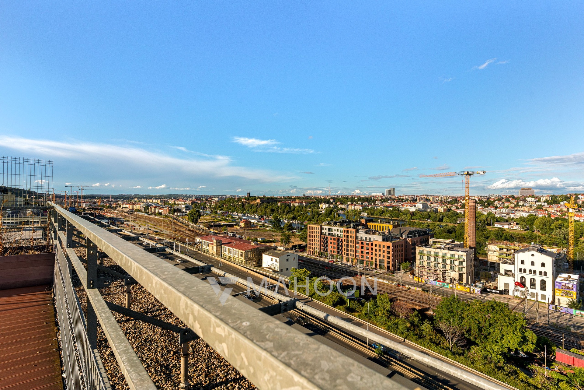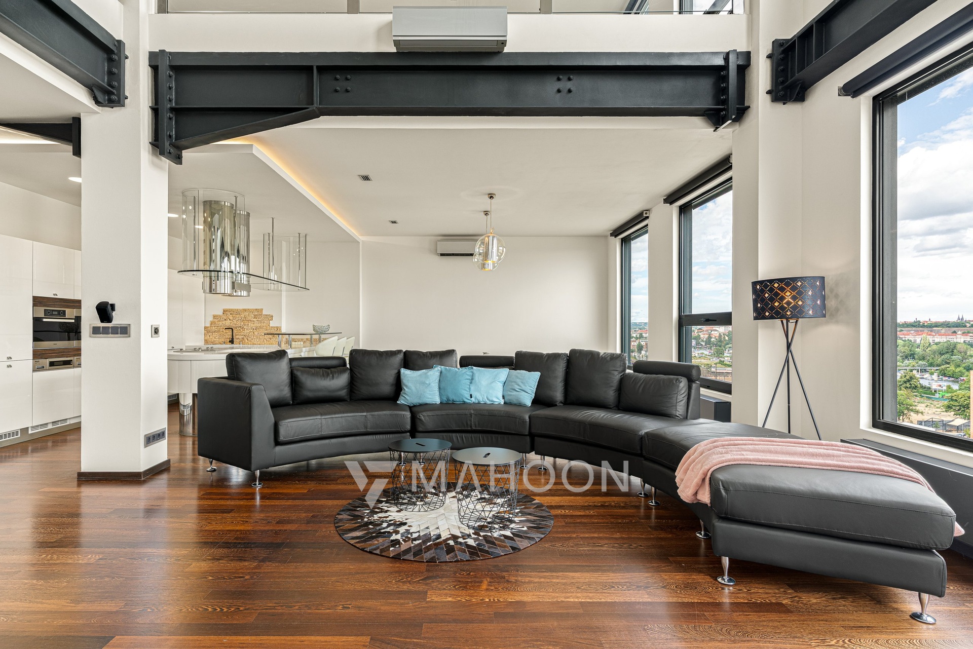 An exceptional studio with an impressive atmosphere and breathtaking views of Vyšehrad, Podolí and Dívčí hrady. This stylish space with a total area of 305 m² is spread over two floors as part of a residential project of the reconstruction of a former factory, which stands out for its high-quality construction and distinctive architecture inspired by the Nordic style.