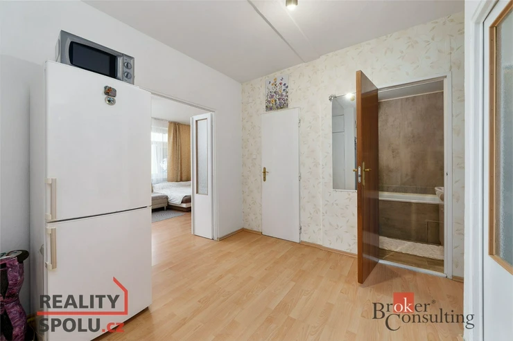 Byt nabízí také zajímavou možnost úpravy na dispozici 3+kk. Jedna z komor, která se nachází v blízkosti koupelny, může být vhodně přestavěna na kuchyňský kout. Současná kuchyně by pak mohla sloužit jako samostatná ložnice. V rámci úprav je rovněž možné zvětšit úložné prostory v chodbě směrem ke vstupu do obývacího pokoje.