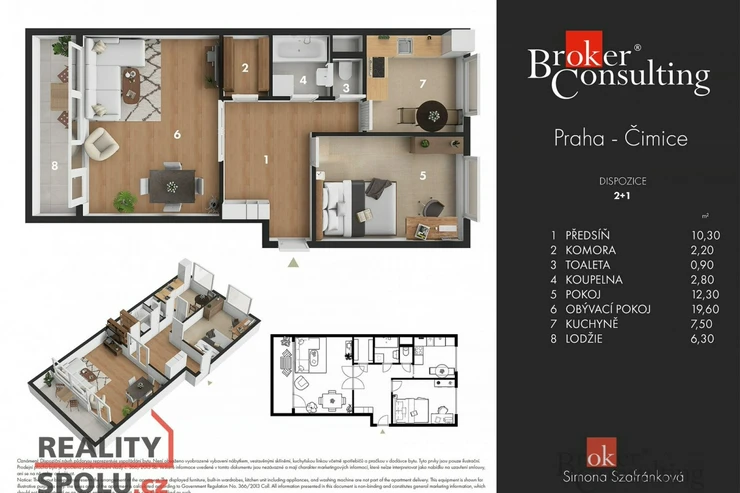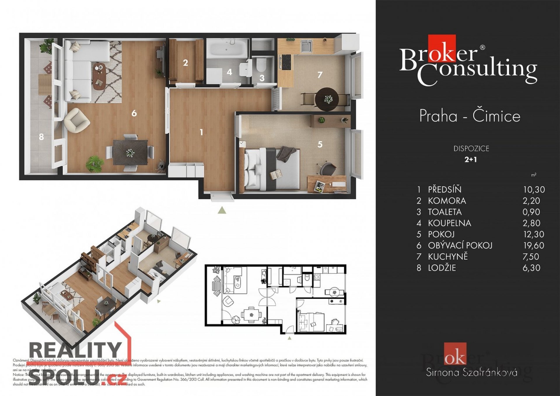 Obývací pokoj se vstupem na lodžii orientovanou na východ, kuchyně a ložnice orientované na západ, koupelna s vanou a přípojkou na pračku, samostatné WC, dvě komory a vstupní chodba.