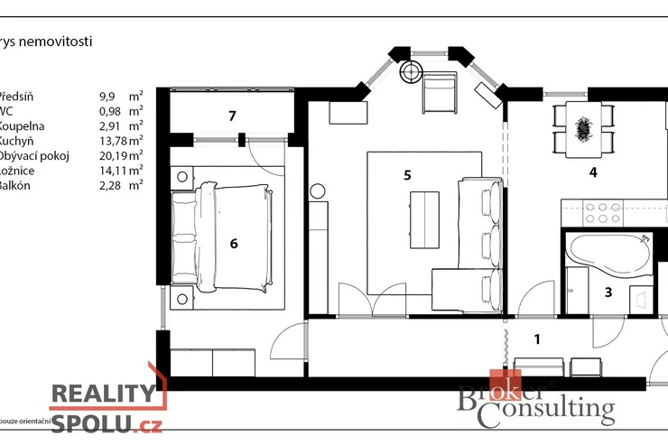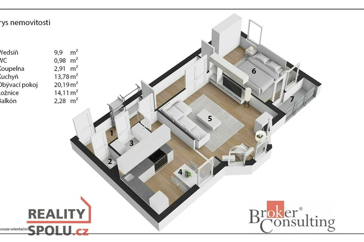 Bytová jednotka se skládá z prosvětleného obývacího pokoje, samostatné kuchyně, ložnice se vstupem na lodžii, dlouhé předsíně s úložnými prostory, koupelny a samostatného WC.