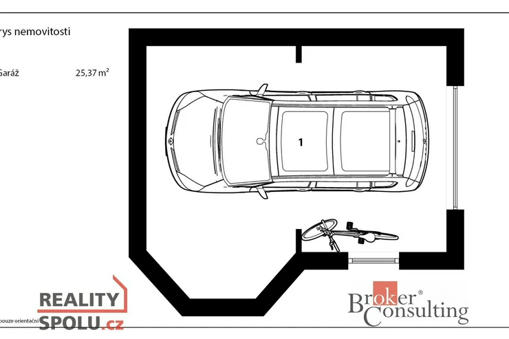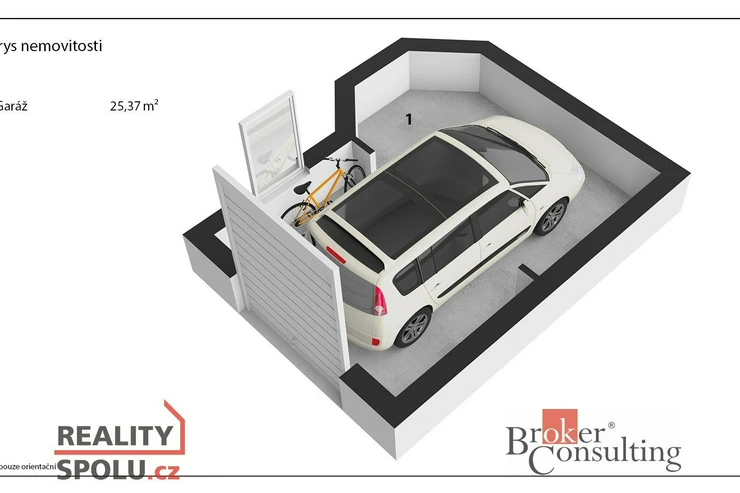 Prostorná garáž (25,37m2) je přímo v domě. Má samostatná vrata a dostatek úložného prostoru i po zaparkování vozu.