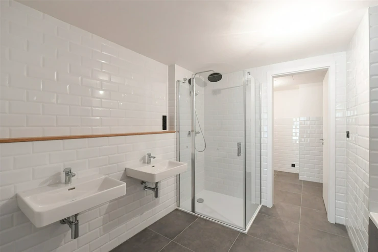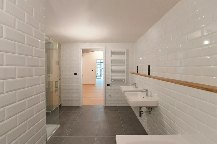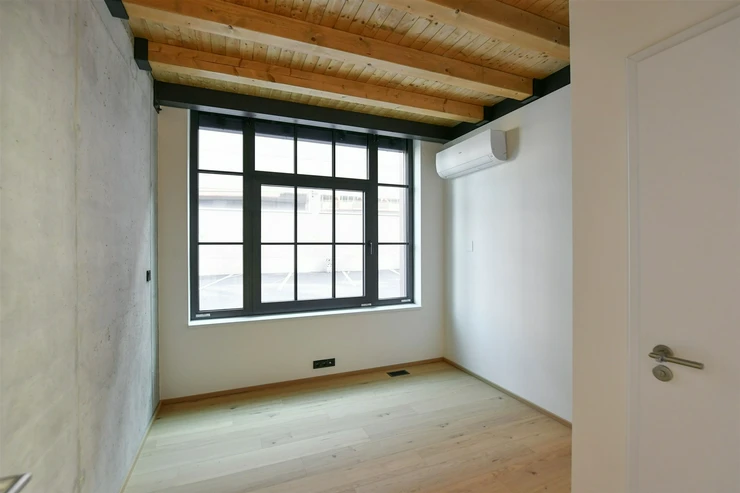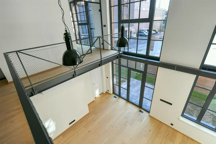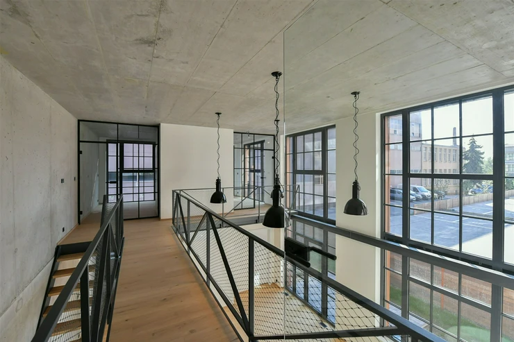 The building’s architecture is inspired by the industrial heritage of Vysočany, creating a unique, timeless residential atmosphere.