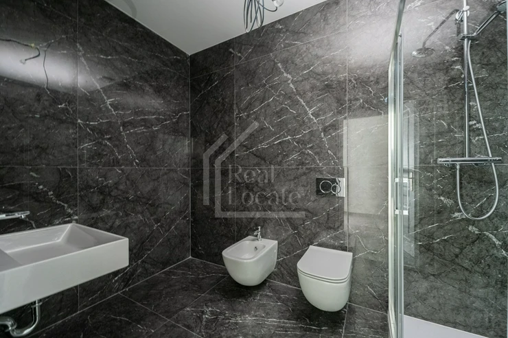 The apartment is spacious and bright and features high quality Italian materials, wooden floors, beautiful bi-fold doors and mullioned windows. The apartment has high ceilings (3 m), two spacious bathrooms with shower and marble tiles. The front door is made of high quality Italian solid wood.