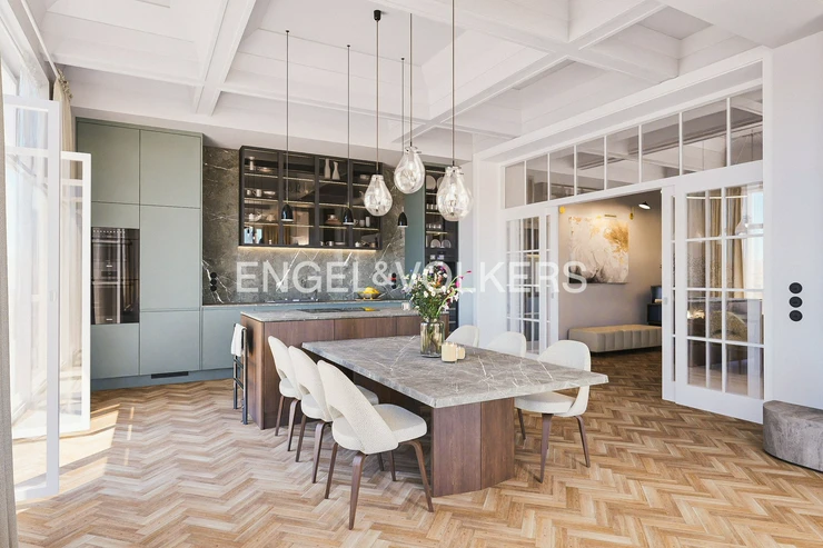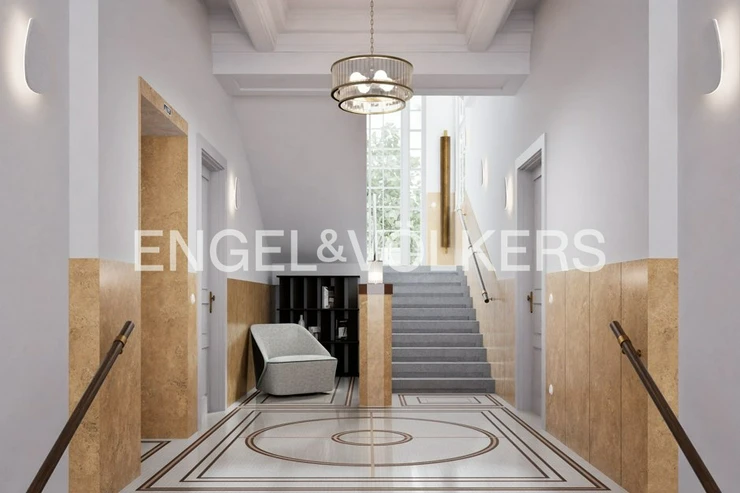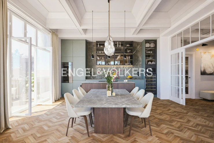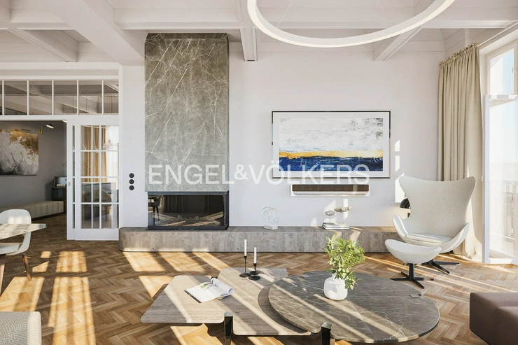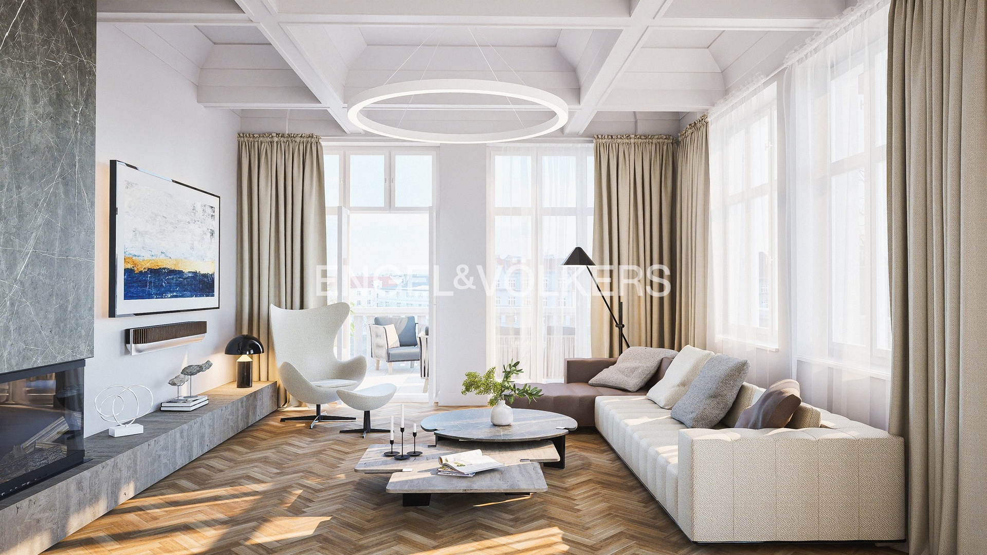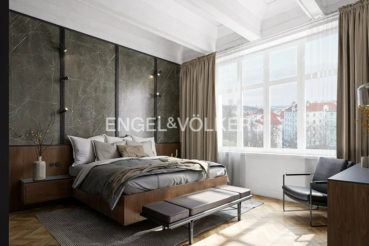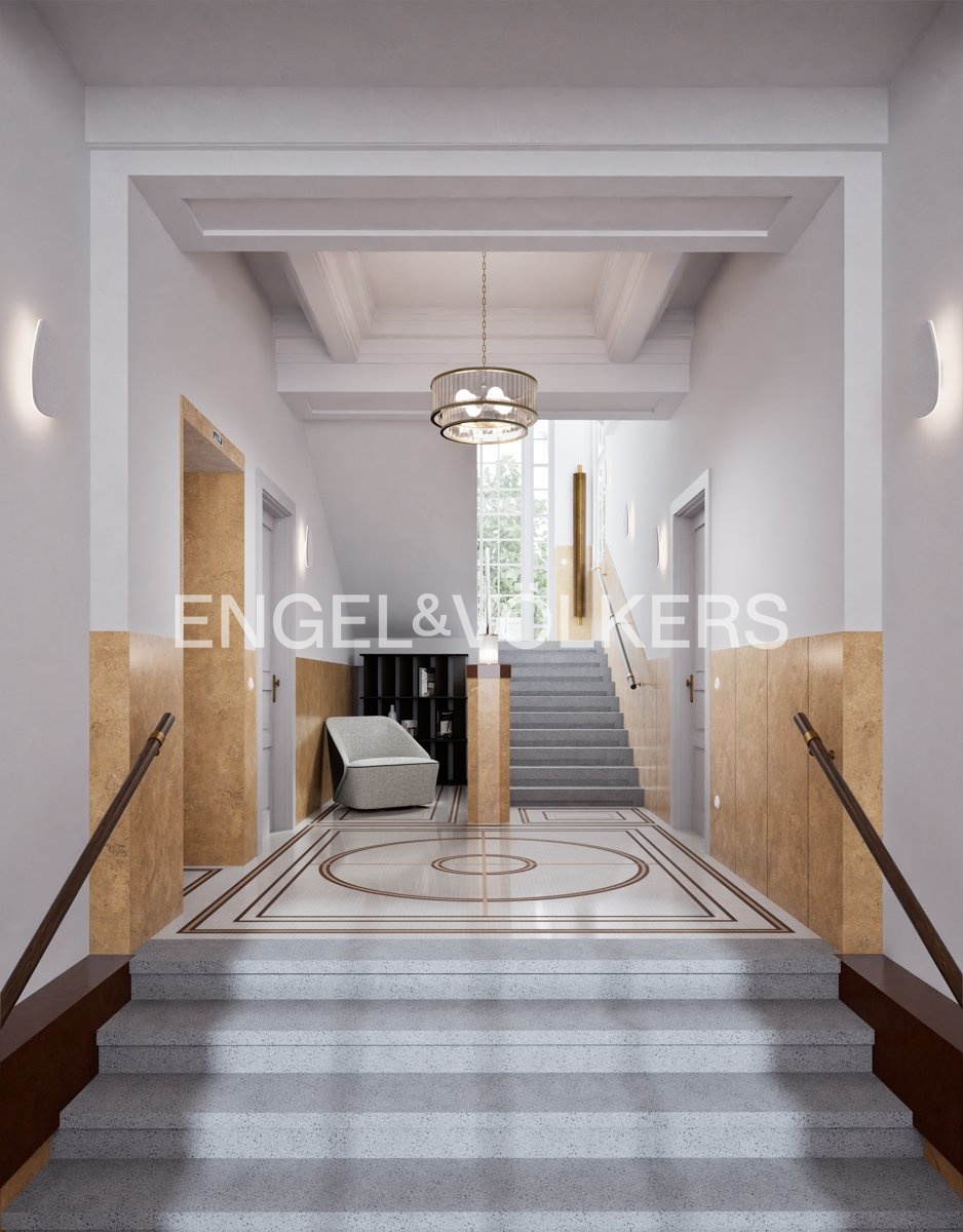 The apartment unit on the 2nd floor offers a generous 5+1 layout with a floor area of 200 sqm. It comes with a private front garden with a terrace of 118 sqm. A unique feature is the period loggia with columns, a significant architectural element of the entire house. The centerpiece of the layout is a spacious entrance hall connected to a bright dining room with a kitchen. The living room with French windows is separate, providing ample space for peace and relaxation. The apartment includes three bedrooms and a study. Two bedrooms feature en-suite bathrooms and walk-in closets, with access to either the loggia or the terrace with a garden. Most rooms have large French windows, bringing pleasant views of the city and garden.