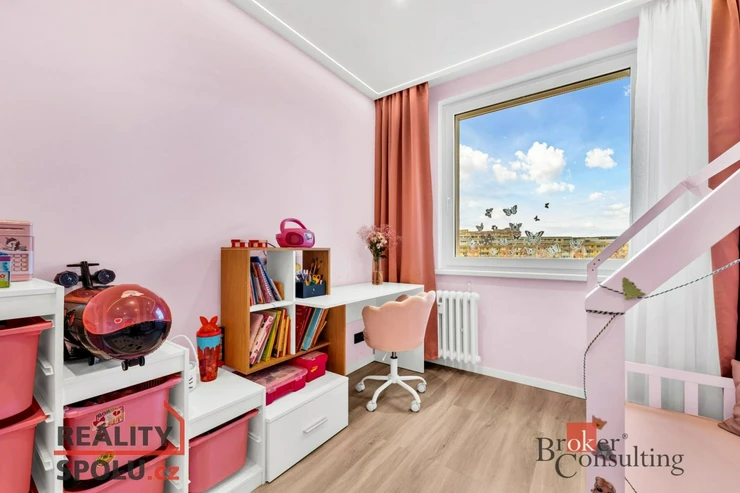 Byt se skládá z prostorného obývacího pokoje, samostatné kuchyně, ložnice s výstupem na balkon, dětského pokoje. V bytě je samostatné WC, koupelna a šatna.
