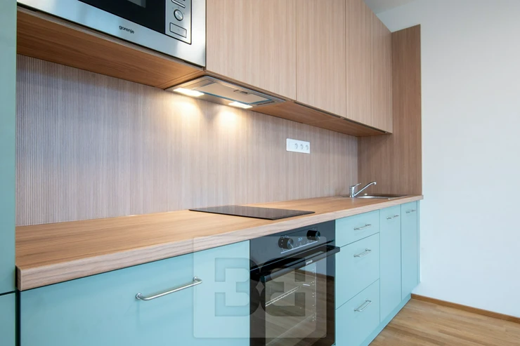 The apartment faces west, providing a pleasant atmosphere and plenty of natural light. The layout consists of a living room with a modern fitted kitchen (including a refrigerator, dishwasher, oven, induction hob, and extractor hood), a spacious bathroom with a shower and toilet. The bathroom is further equipped with a bidet shower, heating ladder, and a designated space for a washing machine and dryer. A cellar unit of 1.8 m² also belongs to the apartment.