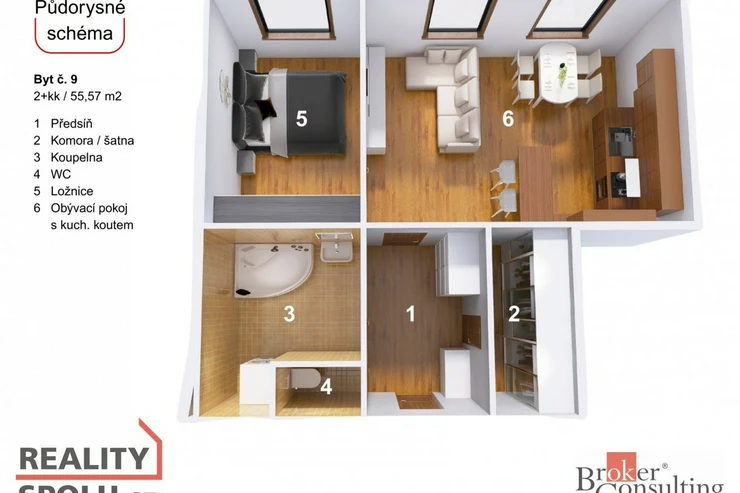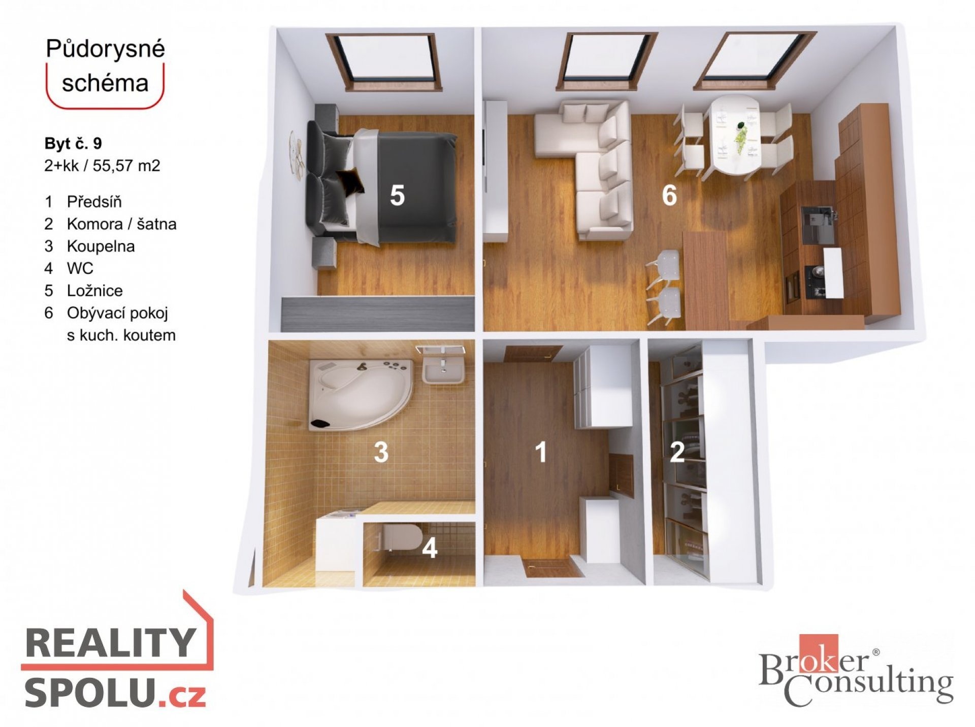 Bytová jednotka se skládá z prostorného obývacího pokoje s kuchyňským koutem. Na něj navazuje samostatná ložnice. Koupelna je vybavena rohovou vanou, s dostatkem prostoru pro pračku i sušičku a je oddělena od samostatného WC. Výhodou této bytové jednotky je praktická komora vedle vstupní předsíně, kterou je možné využít jako šatnu.