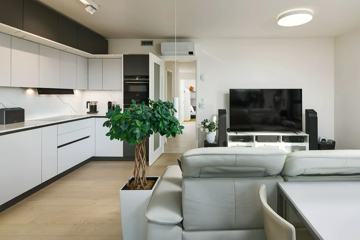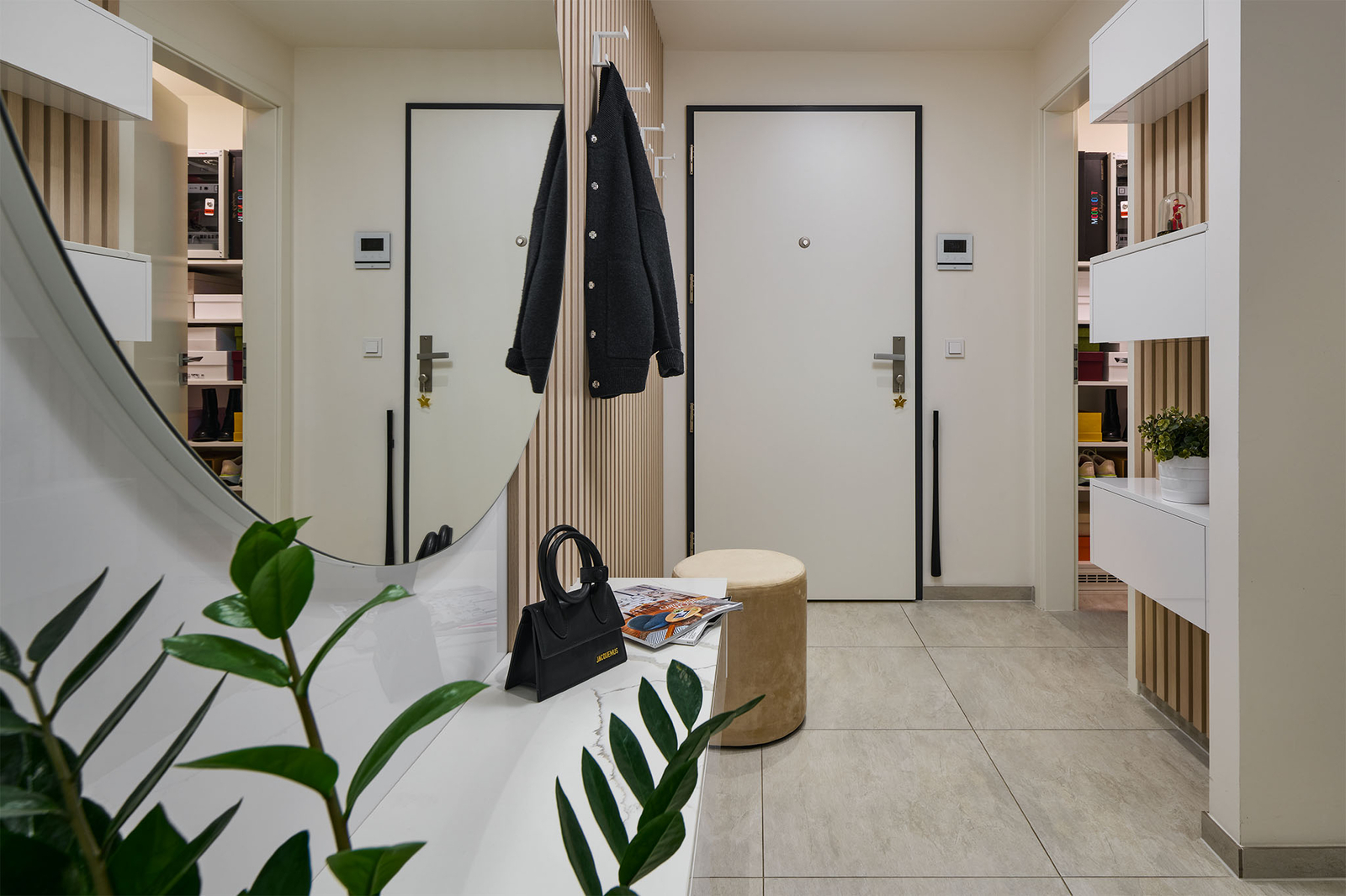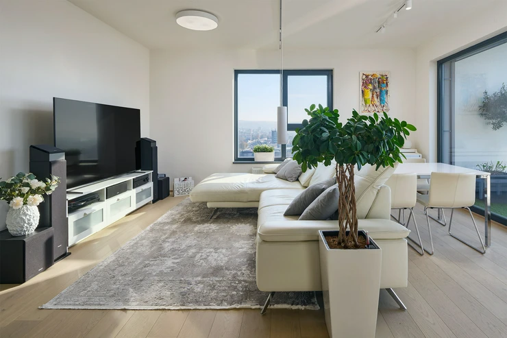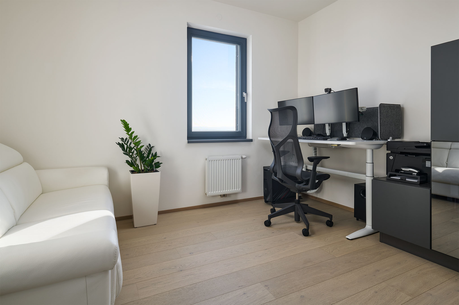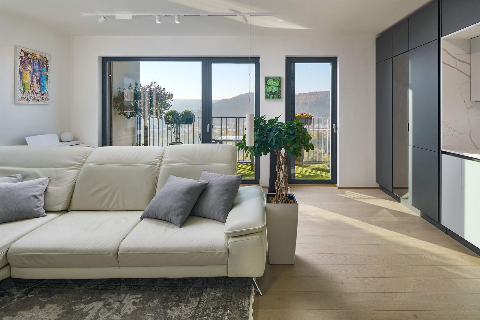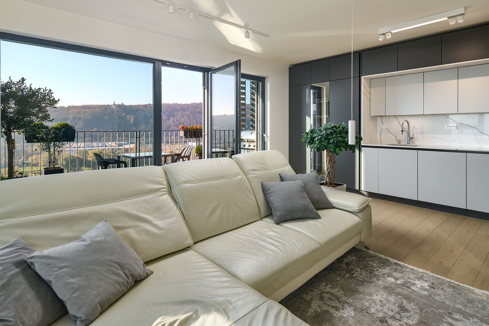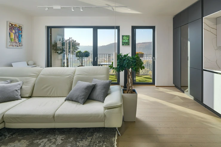 Thanks to its corner location and the absence of neighbours, you will be surrounded by silence and ever-changing views. The apartment's layout has been thoughtfully modified, and no expense has been spared in selecting additional materials. The result? One of the most beautiful apartments in Modřany, with every detail carefully considered.