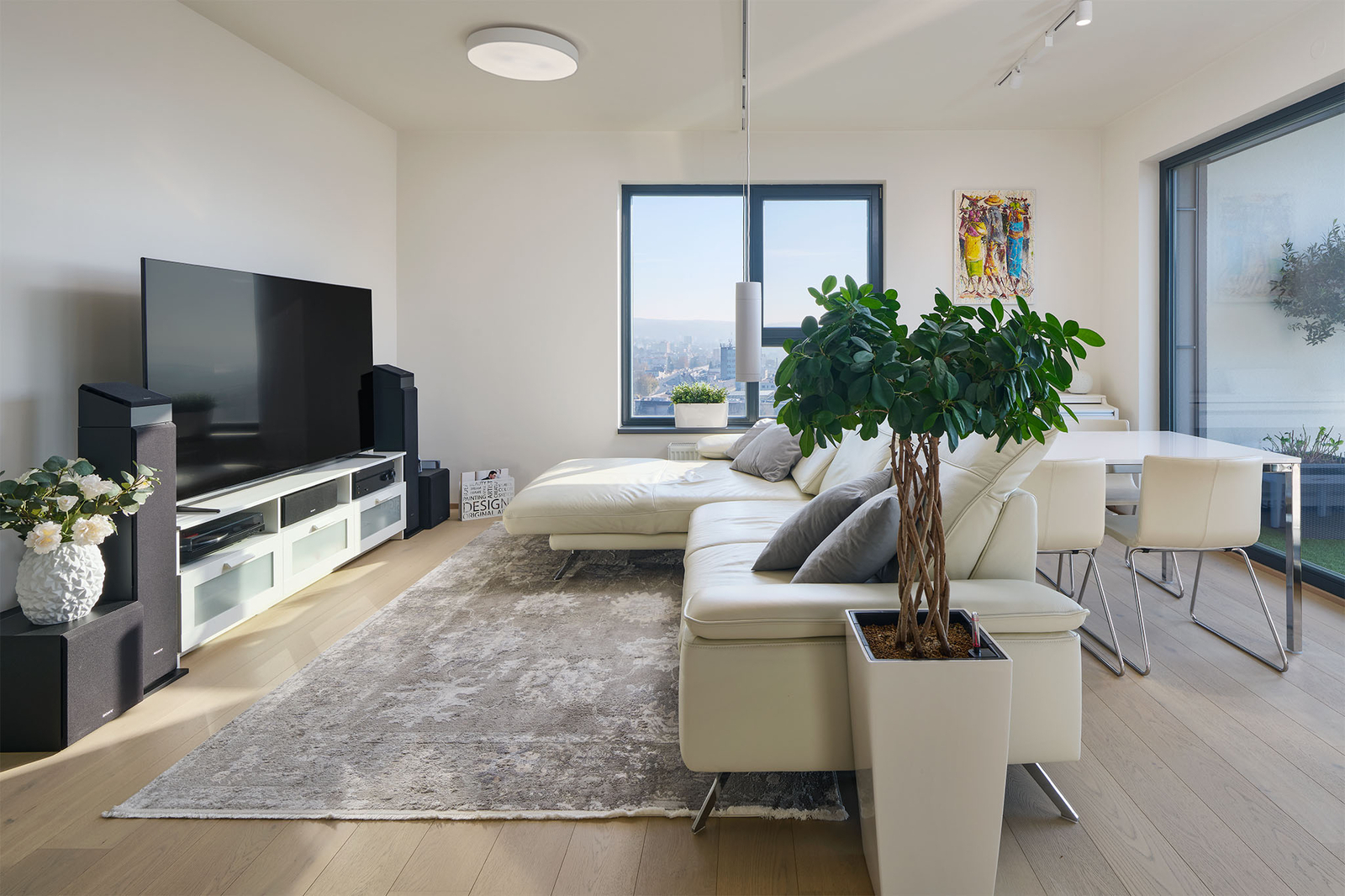 The loggia, with an automatic irrigation system, adds another dimension to the apartment – a place where you can slow down and relax.