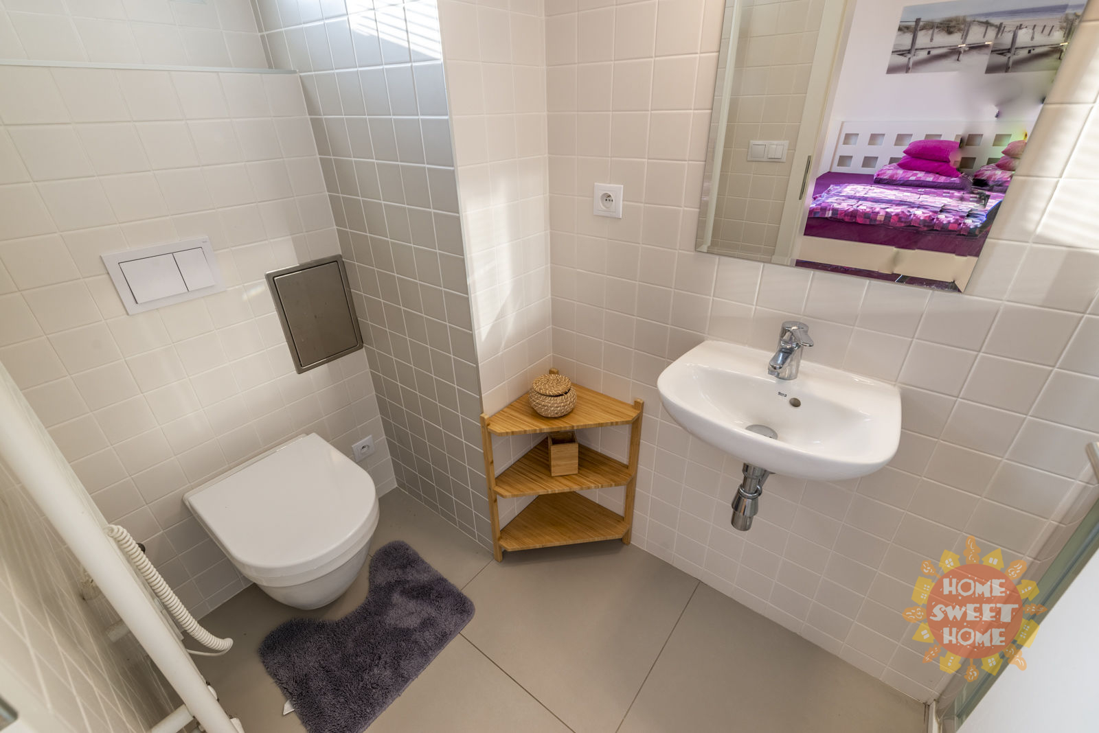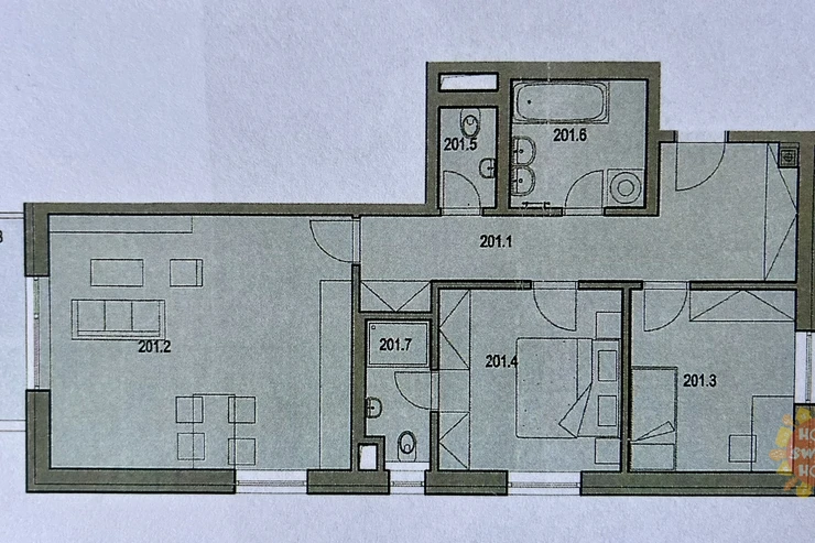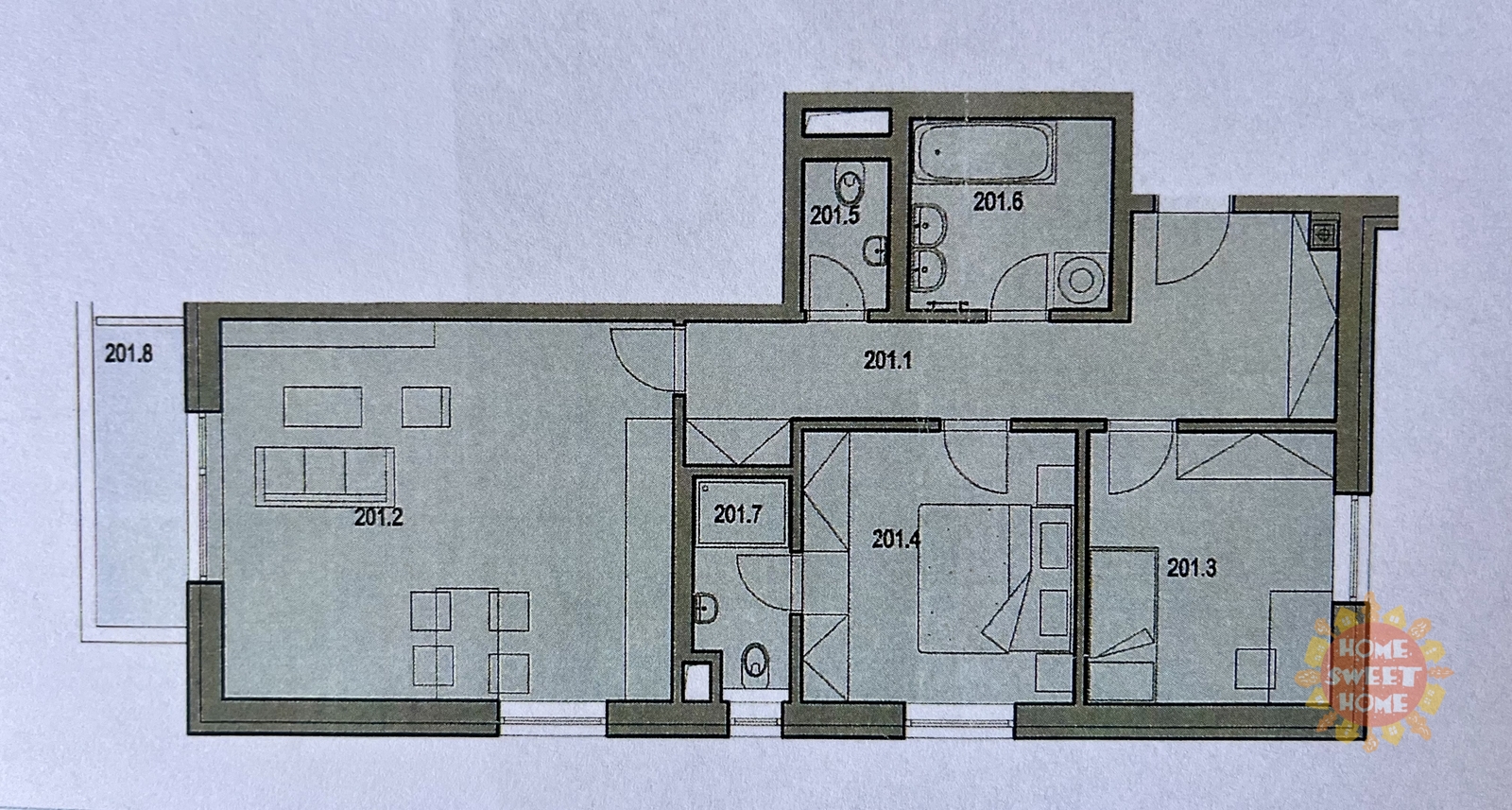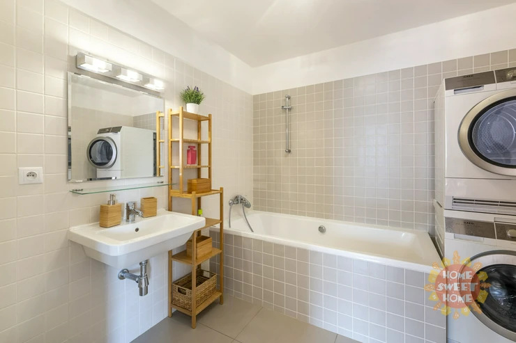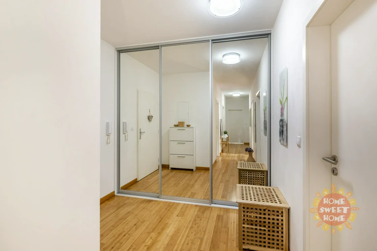 The apartment consists of an entrance hall (15.20 m²), a living room with a kitchenette (28.70 m²) and access to a balcony (5 m²) with a beautiful view of the adjacent park. The kitchen is equipped with modern appliances, including a ceramic hob, electric oven, microwave, dishwasher, fridge-freezer, coffee machine, and extractor hood. There is also a bedroom (12.20 m²) with its own bathroom with shower and toilet (3.40 m²), a children's room/study (10.90 m²), a second large bathroom (6.20 m²), and a separate toilet (2.20 m²).