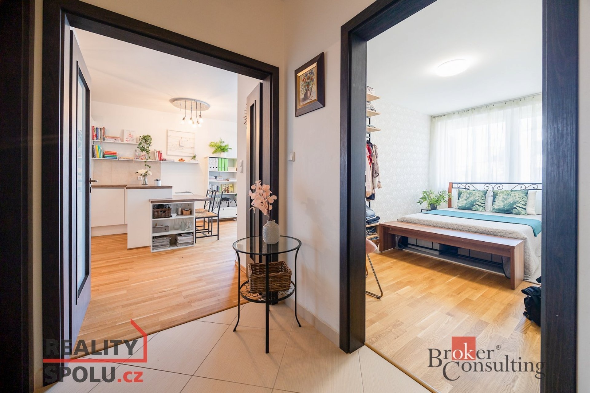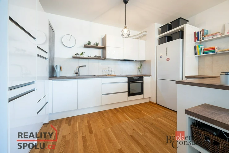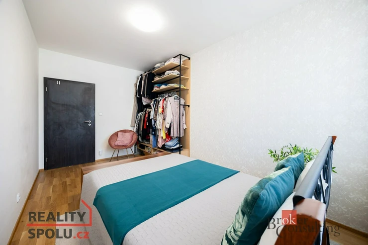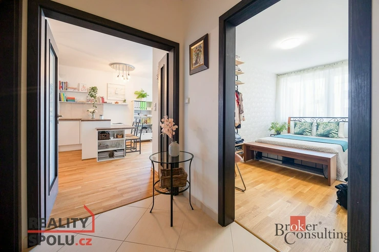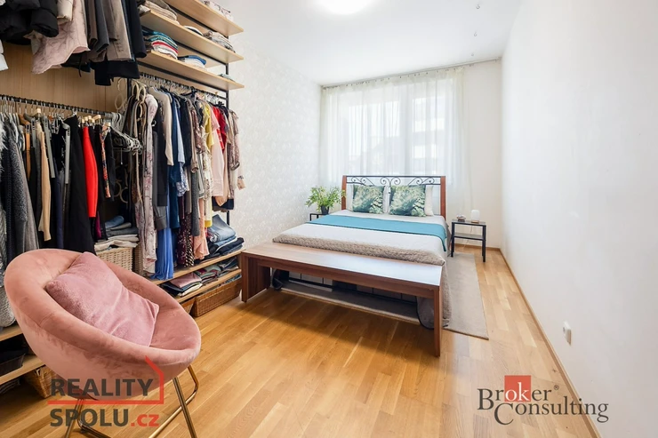 Každý detail byl koncipován s ohledem na praktičnost i komfortní každodenní užívání. Kuchyňská část je elegantně oddělena, takže nenarušuje obytný prostor a umožňuje skutečně pohodlný životní styl. Samostatná šatna pak přidává bytu funkčnost, kterou obvykle najdete až u bytů vyšší kategorie.