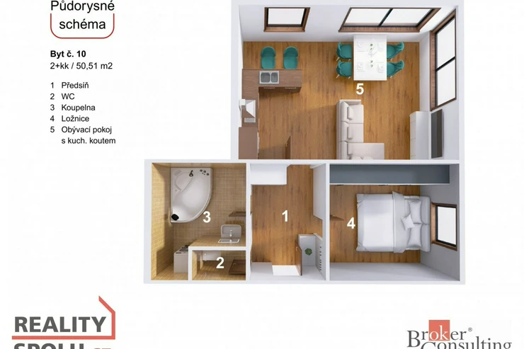 Bytová jednotka se skládá z prostorného obývacího pokoje s kuchyňským koutem. Na něj navazuje samostatná ložnice zajišťující soukromí a klid. Koupelna je vybavena rohovou vanou, s dostatkem prostoru pro pračku i sušičku a je oddělena od samostatného WC.