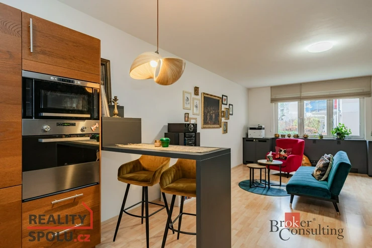 • moderní kuchyň a barové posezení, laděné do přírodního dřeva s tmavými akcenty, ideální pro společné vaření i večerní sklenku vína.