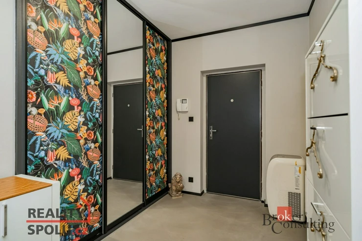 Vstupní hala je nejen praktická, ale také estetická. Stylové madla, zrcadla, kvalitní úložné prostory a dekorace vytvářejí pocit, že vstupujete do unikátní galerie. Odtud vedou dveře do jednotlivých částí bytu, ale také do uzavřené noční zóny.