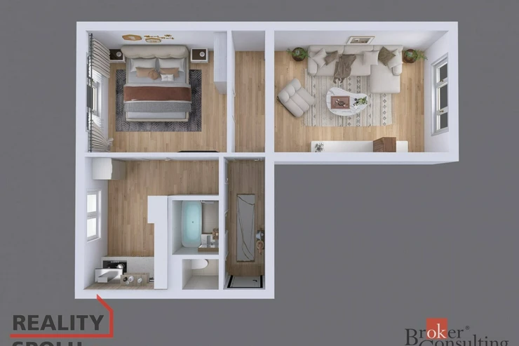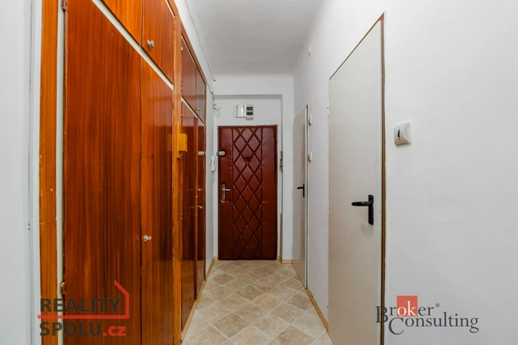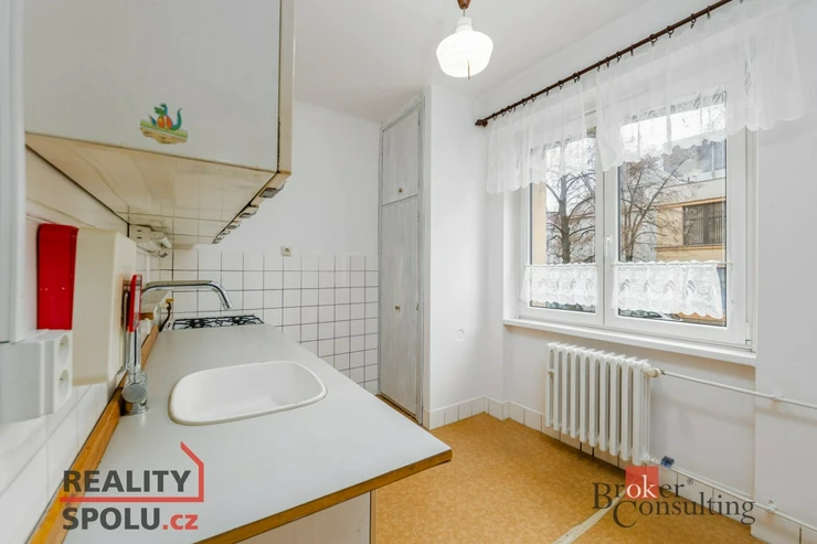 Dispozici tvoří předsíň, samostatná toaleta, koupelna, kuchyně, ložnice a prostorný obývací pokoj. Dům je po kompletní revitalizaci a díky výtahu a podestě nabízí zcela bezbariérový přístup. K bytu náleží také sklepní kóje ( 1,7 m2 ).
