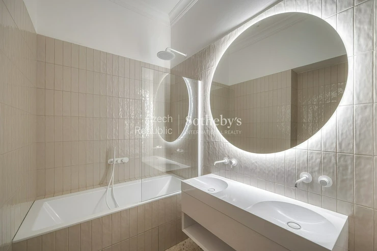 New wooden floors have been laid in all rooms. The bathrooms have Portuguese terrazzo floors and underfloor heating, walls with ceramic tiles from Spain and fittings and sanitary objects from the brands Huppe and Ravak. The interior is fitted with designer lighting from the brands Lasvit, Orion and Lumories.