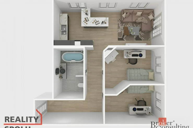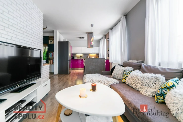 Byt nabízí moderní obývací prostor s kuchyňským koutem, dvě ložnice, koupelnu s vanou i sprchou a samostatnou toaletu. Díky velkým oknům je interiér krásně prosvětlený.