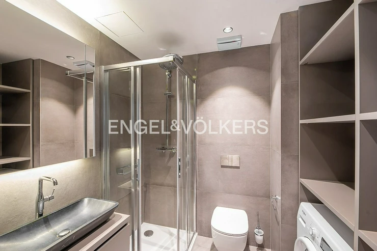Apartment number 503 offers a hallway with a built-in wardrobe, a spacious bathroom with a shower, and a main living room with an elegant and practical kitchen unit. The apartment is airy and bright thanks to its southern orientation and location on one of the highest floors.