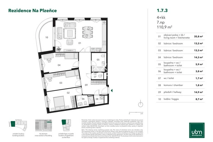 We are exclusively offering a three-bedroom apartment for sale. It offers a generous floor area of 110.9 sqm, which provides enough space for comfortable living even for larger families. The apartment has a spacious balcony measuring 17.4 sqm, which serves as a pleasant extension of the living space to the exterior. The entire apartment is designed to provide airiness and plenty of natural light throughout the day, creating a pleasant and peaceful atmosphere. The Na Plzence Residence is a modern and ecological residential project in the dynamically developing Smichov district. It offers 160 apartments with layouts from 1 to 4 bedrooms, high–standard fittings, and class-A energy efficiency (EPC). The project uses geothermal boreholes, heat pumps, and photovoltaic panels, which reduce operating costs and provide efficient heating and cooling. The residence includes a private courtyard with green space, a two-storey underground garage with charging stations for electric vehicles, and facilities for cyclists.Housing in the Na Plzence Residence combines modern style, energy efficiency and excellent accessibility in the dynamically developing district of Smichov.Construction is already underway, with completion scheduled for the year 2027.Large-format windows with wooden frames and triple glazing bring in plenty of daylight while providing excellent thermal insulation.The apartment has wooden floors and underfloor heating, which provide a comfortable temperature in any season and can replace air conditioning.Smichov is one of Prague's fastest-developing districts and will undergo a significant transformation in the coming years. As part of the revitalisation of the area around the Smichov railway station, a new transport terminal will be built to connect the metro, train station, tram and bus lines with a large P+R car park. At the same time, the railway station is being rebuilt, and a new urban district with offices, shops and public spaces will be created in the area.The Residence is within walking distance of the Smichov railway station, line B metro and tram lines, providing excellent transport accessibility. The proximity to the Vltava River and the Smichov Embankment gives the location an unmistakable atmosphere that combines an urban lifestyle with a pleasant environment for everyday life. There is a wide range of restaurants, cafes, shops, pharmacies and medical facilities in the area.