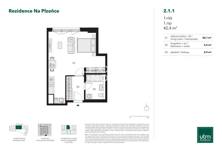 We offer for sale a studio apartment located on the ground floor with a floor area of 42.4 sqm. The unit is designed for maximum efficiency of every square meter, making it an ideal choice for individuals, couples, or as a highly sought-after investment opportunity. Despite its compact dimensions, the apartment is airy, practical, and creates a cozy living atmosphere. The Na Plzence Residence is a modern and ecological residential project in the dynamically developing Smichov district. It offers 160 apartments with layouts from 1 to 4 bedrooms, high–standard fittings, and class-A energy efficiency (EPC). The project uses geothermal boreholes, heat pumps, and photovoltaic panels, which reduce operating costs and provide efficient heating and cooling. The residence includes also a private courtyard with green space.Housing in the Na Plzence Residence combines modern style, energy efficiency and excellent accessibility in the dynamically developing district of Smichov.Construction is already underway, with completion scheduled for the year 2027.Large-format windows with wooden frames and triple glazing bring in plenty of daylight while providing excellent thermal insulation.The apartment has wooden floors and underfloor heating, which provide a comfortable temperature in any season and can replace air conditioning.Smichov is one of Prague's fastest-developing districts and will undergo a significant transformation in the coming years. As part of the revitalisation of the area around the Smichov railway station, a new transport terminal will be built to connect the metro, train station, tram and bus lines with a large P+R car park. At the same time, the railway station is being rebuilt, and a new urban district with offices, shops and public spaces will be created in the area.The Residence is within walking distance of the Smichov railway station, line B metro and tram lines, providing excellent transport accessibility. The proximity to the Vltava River and the Smichov Embankment gives the location an unmistakable atmosphere that combines an urban lifestyle with a pleasant environment for everyday life. There is a wide range of restaurants, cafes, shops, pharmacies and medical facilities in the area.