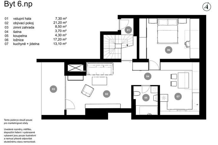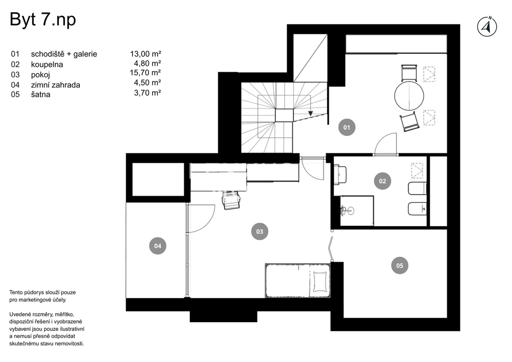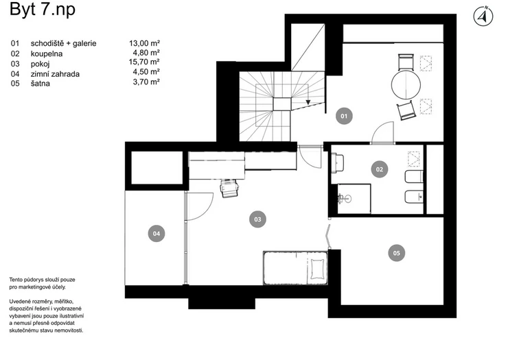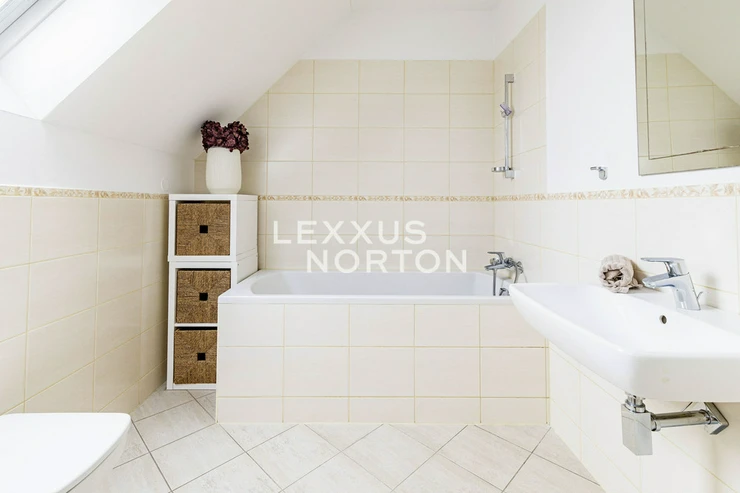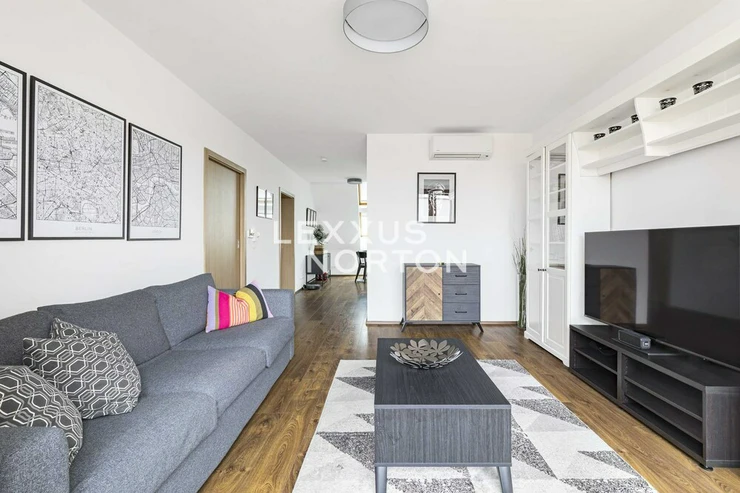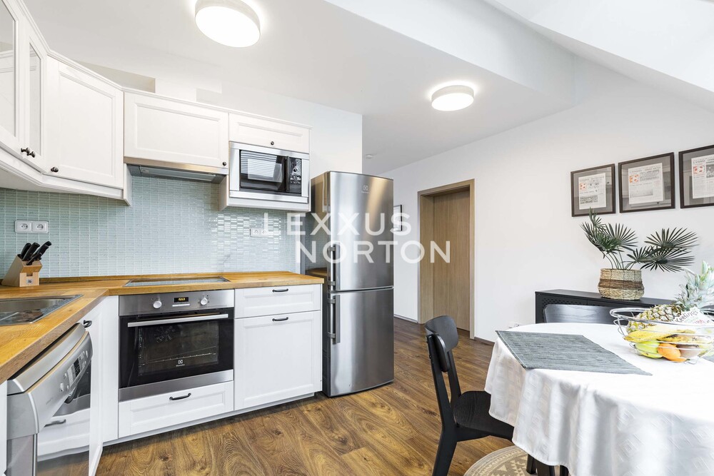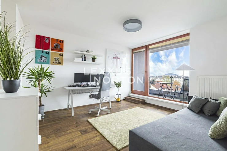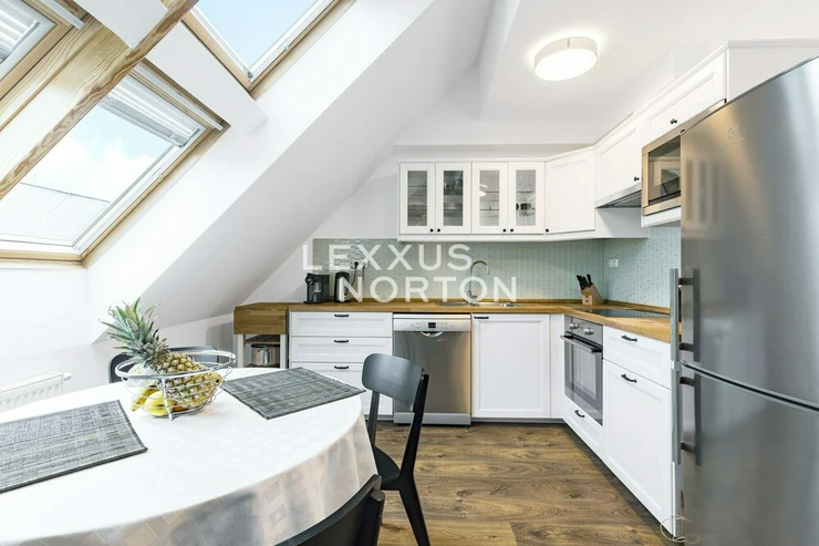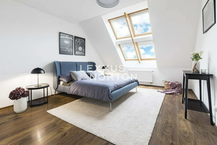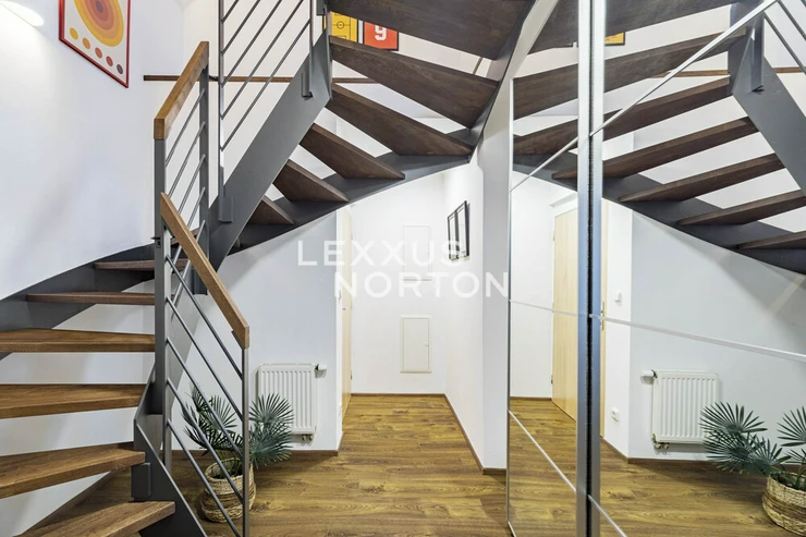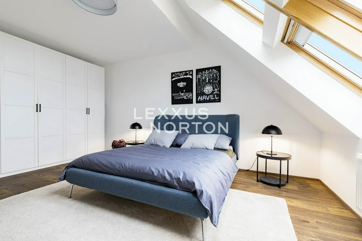 This airy 2-bedroom duplex apartment with a total area of 104 sqm. Terrace and loggia are located in one of the most sought-after parts of Prague 7, on Delnicka Street in Holesovice. It is located on the 6th and 7th floors of a historic building with an elevator and carefully renovated common areas. The lower level of the apartment consists of an open living space with a kitchen and dining area, followed by a separate living room with access to a loggia facing a quiet courtyard. This level also includes a master bedroom, bathroom, and entrance hall. One floor above is a second bedroom with its own loggia oriented to the west with views of the surrounding buildings, along with a bathroom with a bathtub. Thanks to this well-thought-out layout, the apartment offers an above-standard level of privacy and a clear separation between the day and night areas. This apartment is oriented to the west and east. The apartment underwent a complete renovation in 2014 and is in very good condition. The interior style respects the character of the building and combines modern elements with elegant details.Kitchen unit, air conditioning, Vaillant gas boiler for water heating and heating.Holesovice is one of Prague's most dynamically developing districts. It boasts a diverse network of restaurants, cafés, and cultural institutions, led by the DOX and Veletržní palác galleries, as well as all civic amenities. The popular Stromovka and Letenske sady parks are within walking distance. The location also offers excellent transport links — tram lines and the metro (C — Vltavská) provide quick connections to the city center.