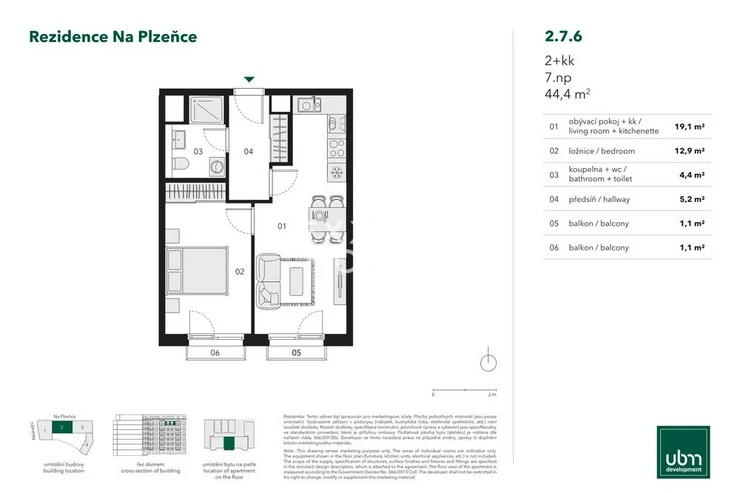 We are offering for sale a cozy and modern one-bedroom apartment with an area of 44.4 sqm, located on the 7th floor, which will delight you with its bright and airy atmosphere. Thanks to its southern orientation, you can enjoy the sun's rays throughout the day, creating a pleasant environment for relaxation. The practical layout of the apartment makes effective use of every square meter of space. On top of that, it is located in an attractive area with excellent access to all services and civic amenities.The Na Plzence Residence is a modern and ecological residential project in the dynamically developing Smichov district. It offers 160 apartments with layouts from 1 to 4 bedrooms, high–standard fittings, and class-A energy efficiency (EPC). The project uses geothermal boreholes, heat pumps, and photovoltaic panels, which reduce operating costs and provide efficient heating and cooling. The residence includes also a private courtyard with green space.Housing in the Na Plzence Residence combines modern style, energy efficiency and excellent accessibility in the dynamically developing district of Smichov.Construction is already underway, with completion scheduled for the year 2027.Large-format windows with wooden frames and triple glazing bring in plenty of daylight while providing excellent thermal insulation.The apartment has wooden floors and underfloor heating, which provide a comfortable temperature in any season and can replace air conditioning.Smichov is one of Prague's fastest-developing districts and will undergo a significant transformation in the coming years. As part of the revitalisation of the area around the Smichov railway station, a new transport terminal will be built to connect the metro, train station, tram and bus lines with a large P+R car park. At the same time, the railway station is being rebuilt, and a new urban district with offices, shops and public spaces will be created in the area.The Residence is within walking distance of the Smichov railway station, line B metro and tram lines, providing excellent transport accessibility. The proximity to the Vltava River and the Smichov Embankment gives the location an unmistakable atmosphere that combines an urban lifestyle with a pleasant environment for everyday life. There is a wide range of restaurants, cafes, shops, pharmacies and medical facilities in the area.