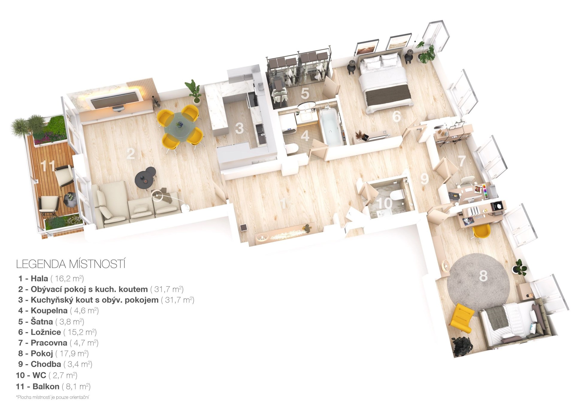The cleverly segmented apartment features a large balcony for ultimate peace, a generous entrance hall, a spacious living room with a kitchen, a main bedroom, a room, a study, a wardrobe, and an extra WC for guests.