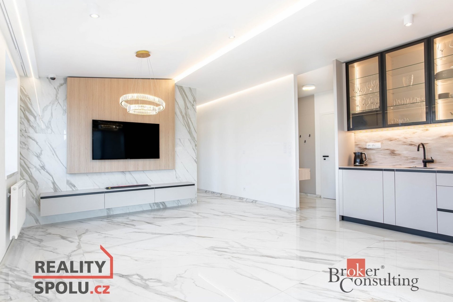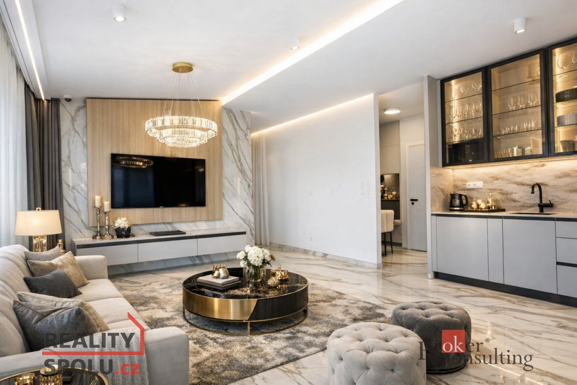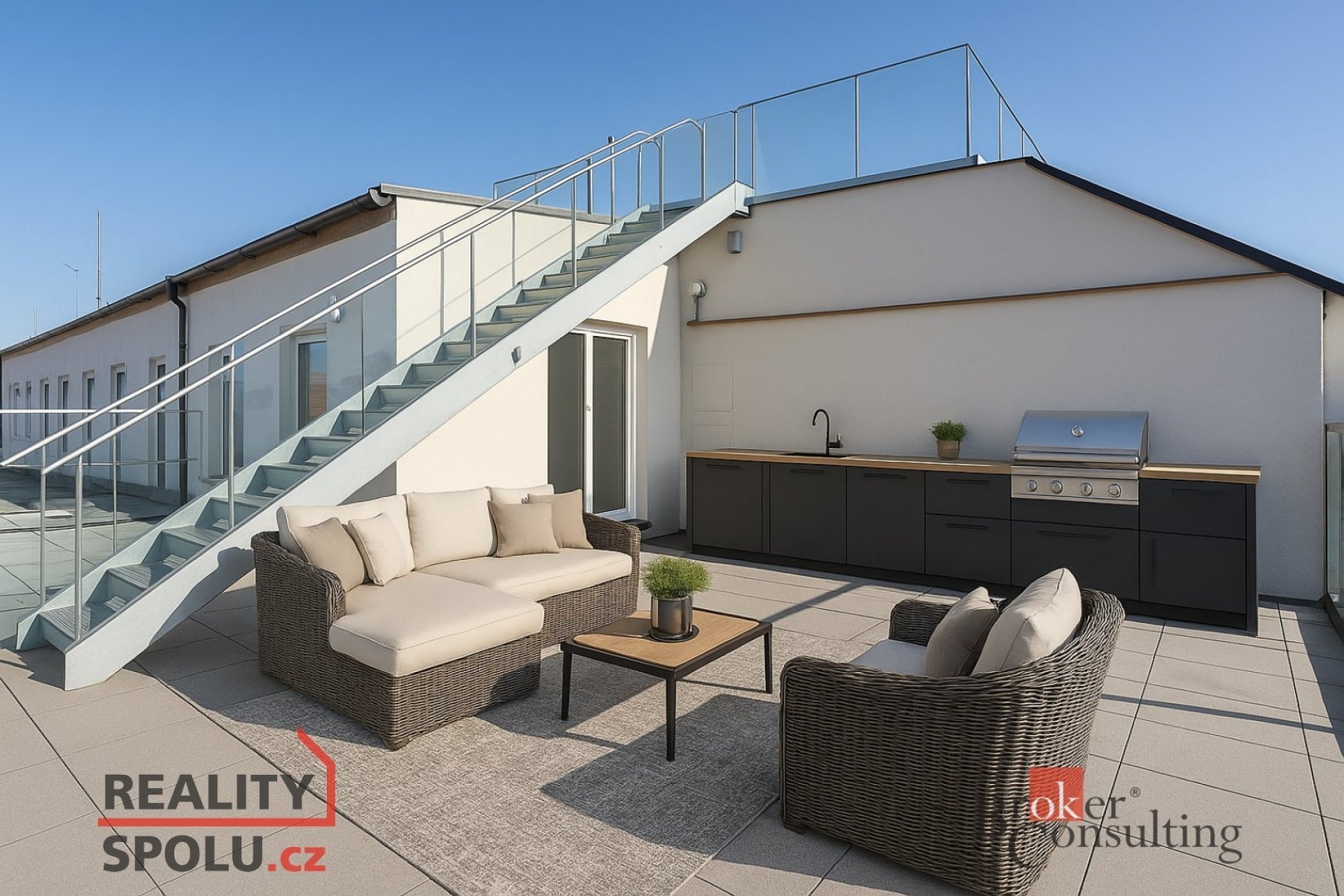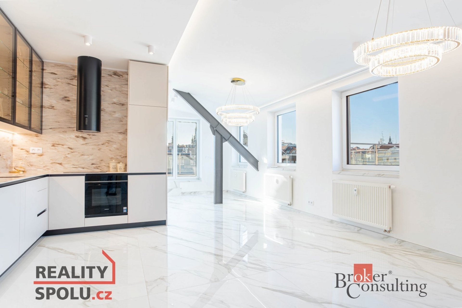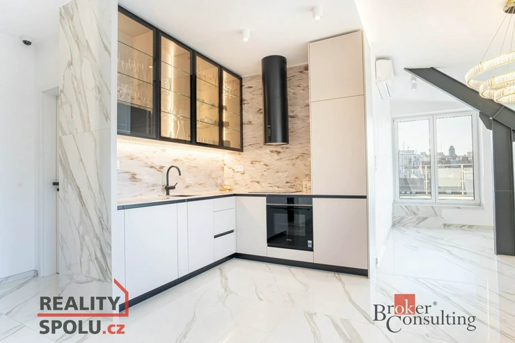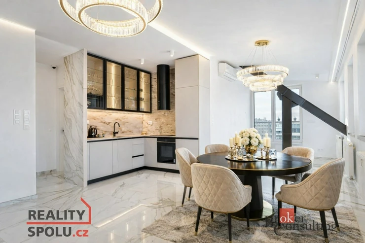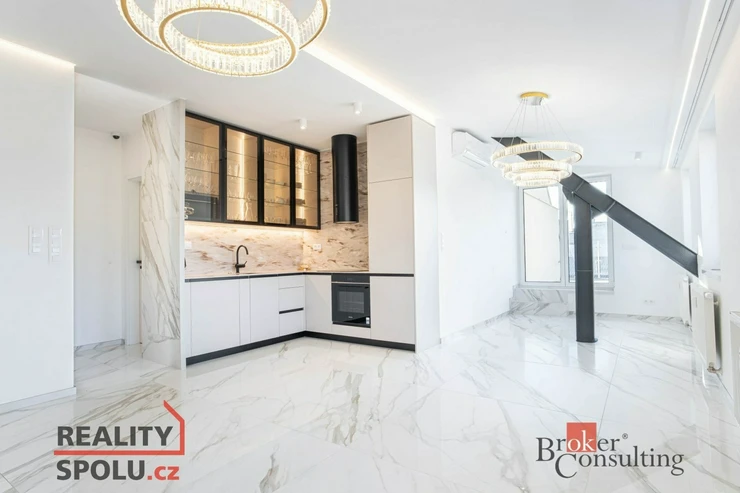 Hlavní částí bytu je velká, prosvětlená obývací místnost propojená s moderní kuchyňskou linkou vybavenou kvalitními spotřebiči. Z obývacího prostoru se vstupuje na soukromou terasu situovanou v horním patře, která poskytuje ideální místo pro relaxaci nebo posezení s přáteli a nabízí krásný výhled na centrum města.