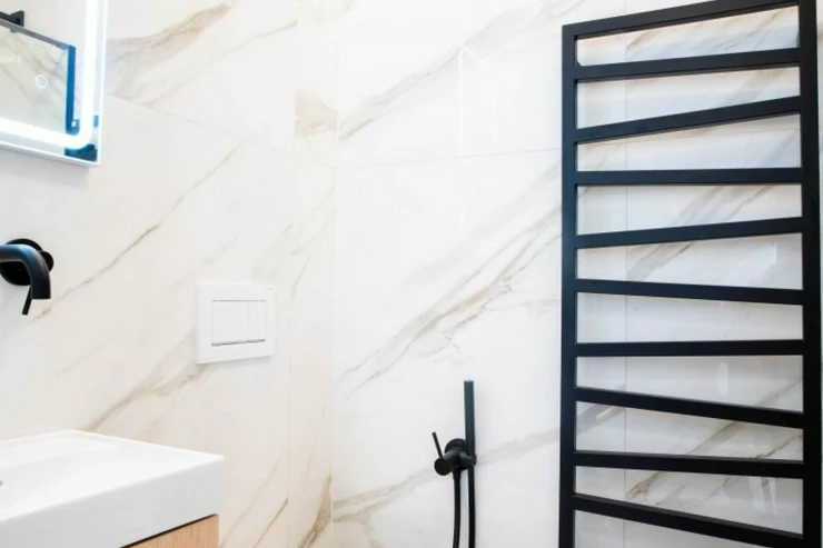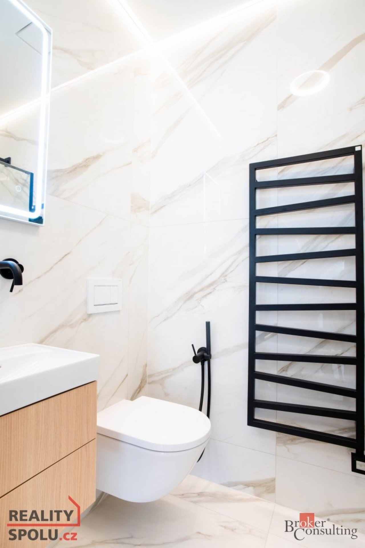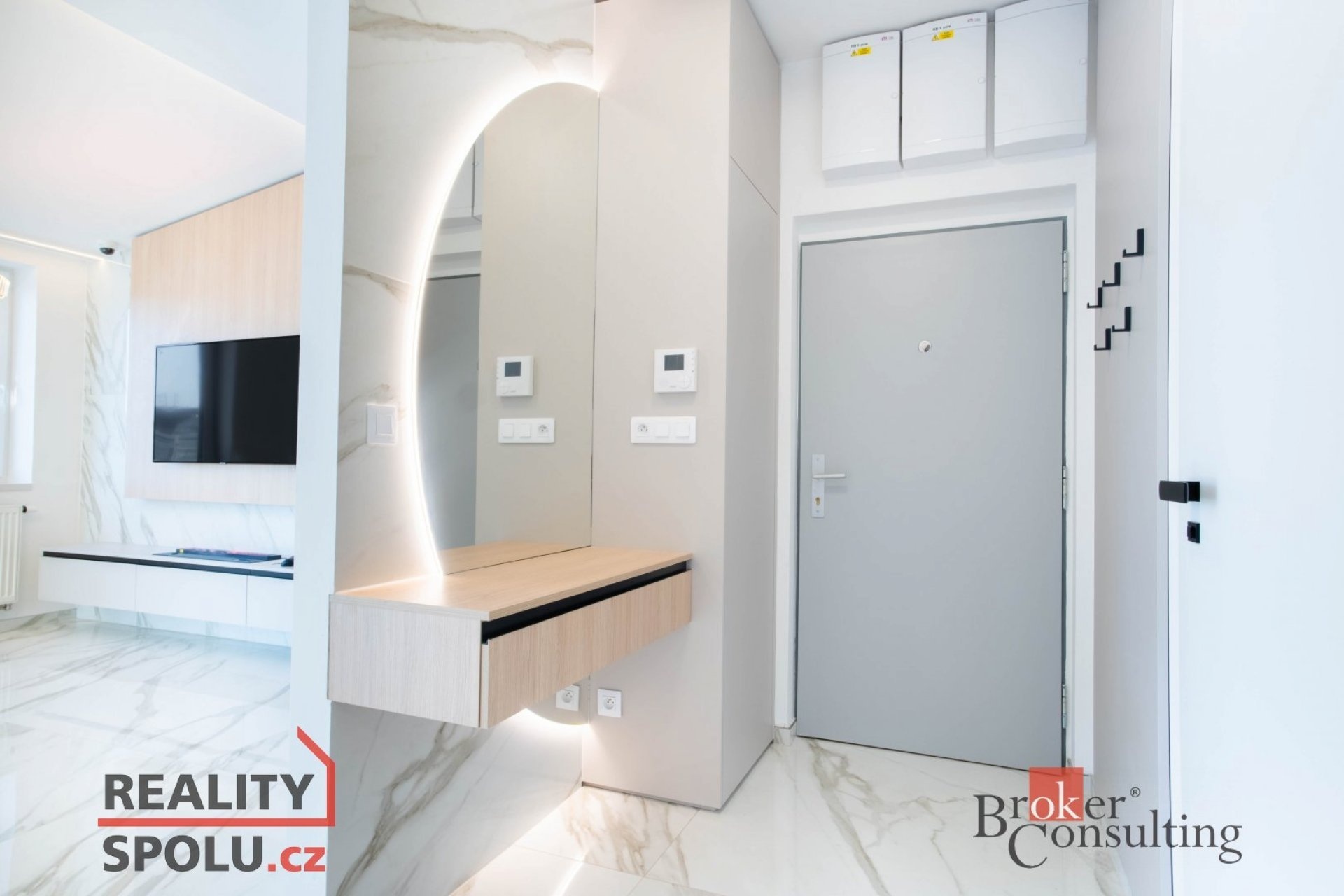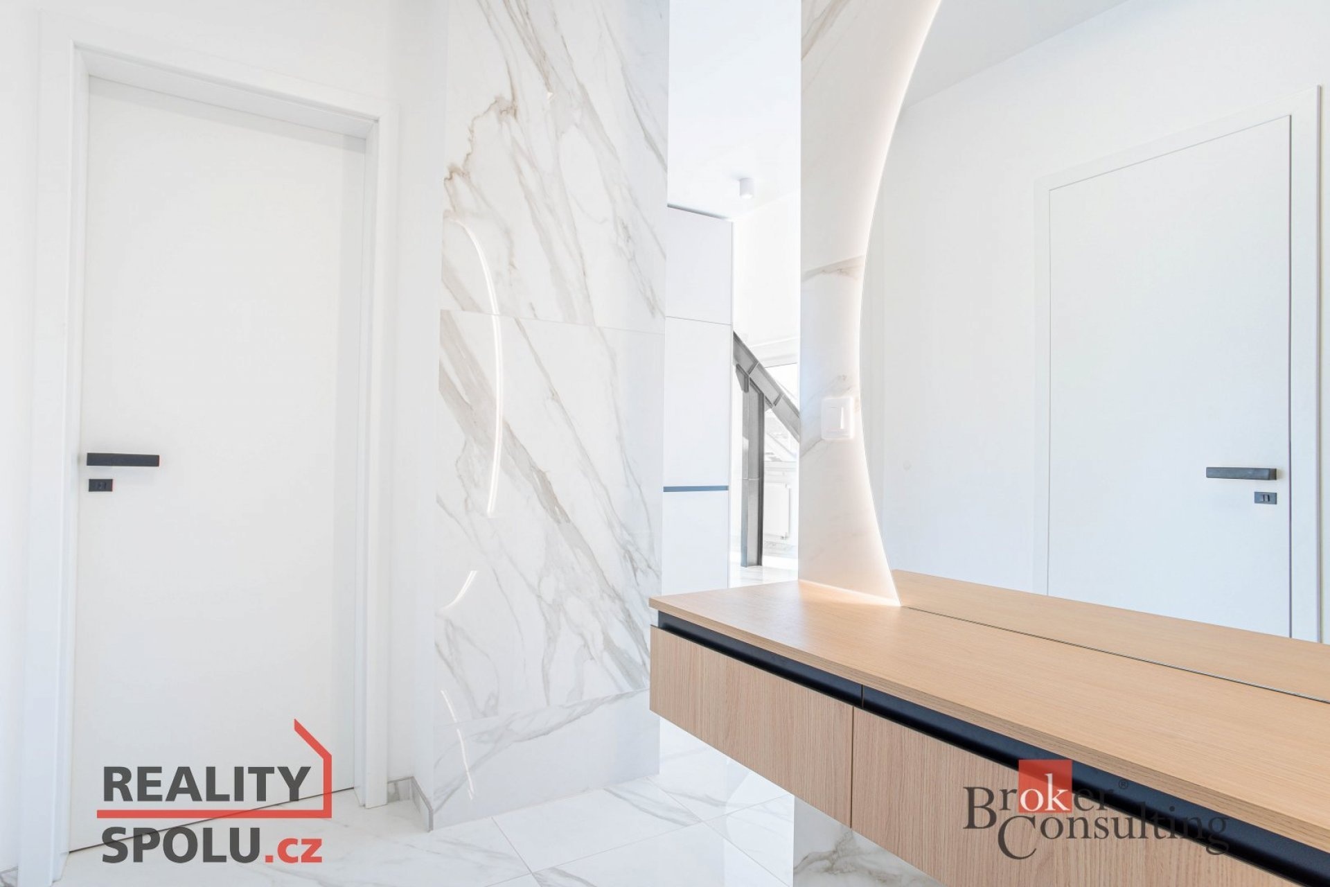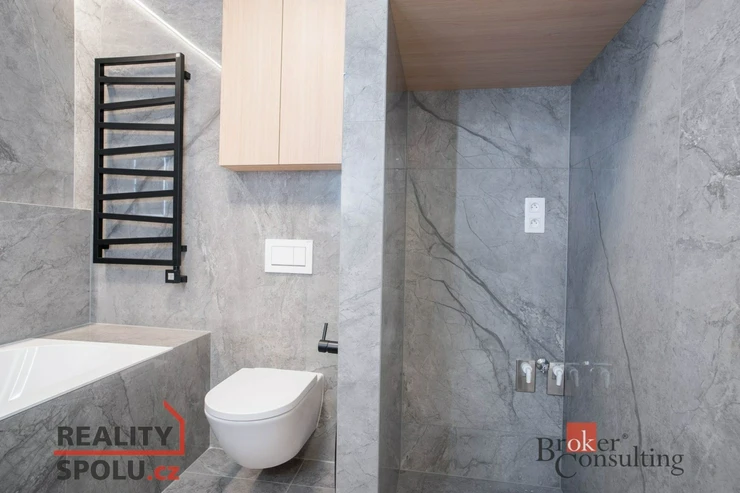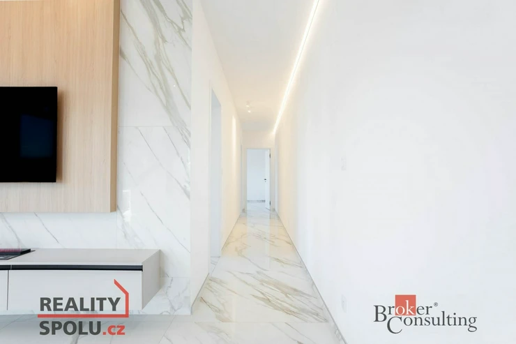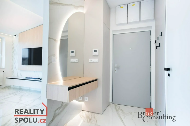 V bytě se nacházejí dvě designové koupelny – jedna vybavená prostornou vanou a toaletou a druhá se sprchovým koutem a taktéž s toaletou. Elegantní chodba s efektním kulatým zrcadlem dotváří luxusní atmosféru celého interiéru a poskytuje dostatek prostoru a úložných možností.