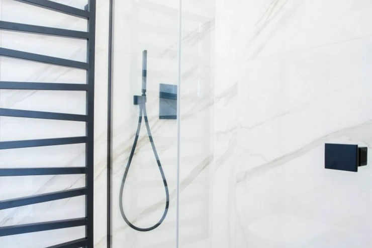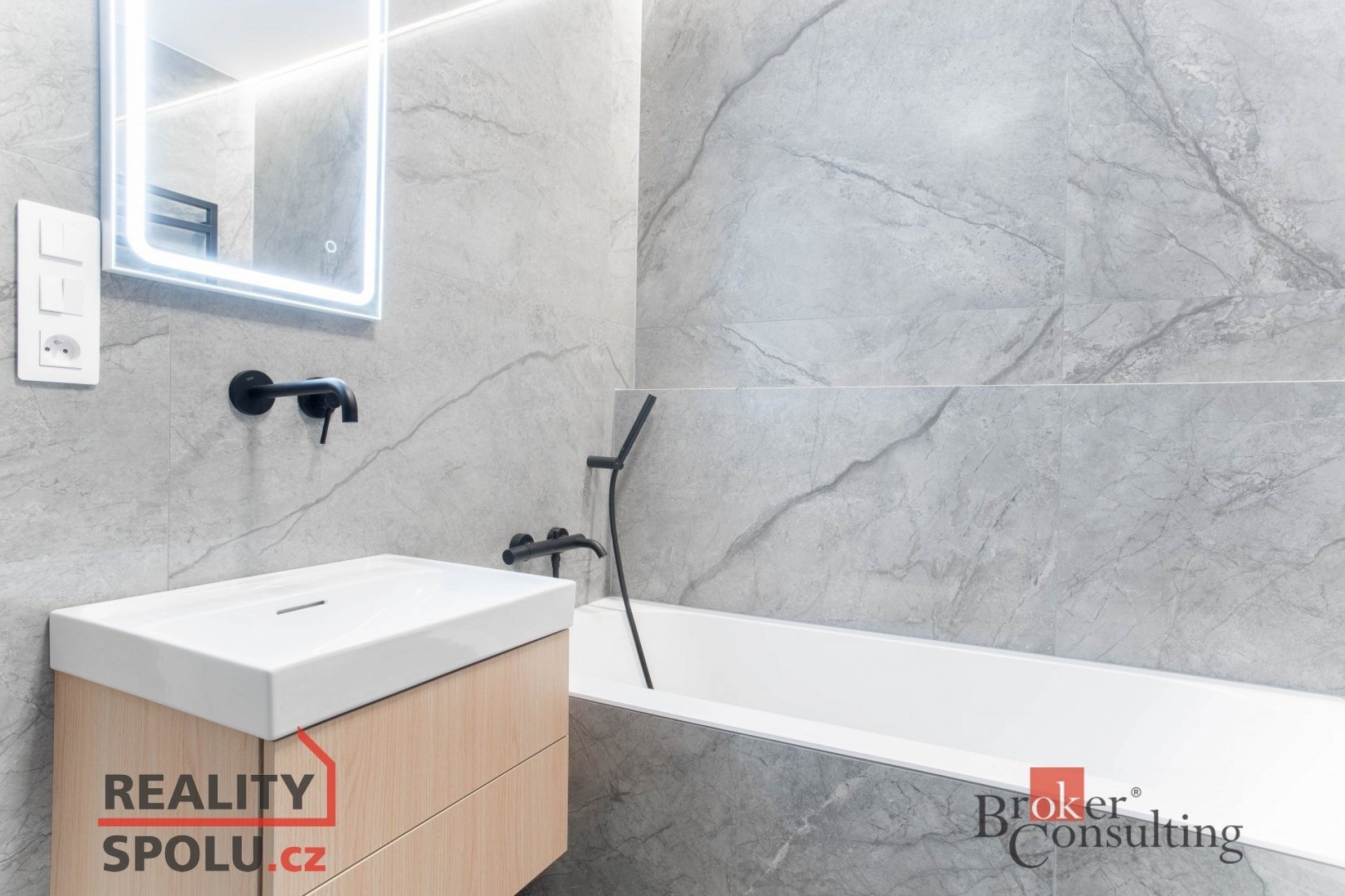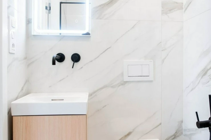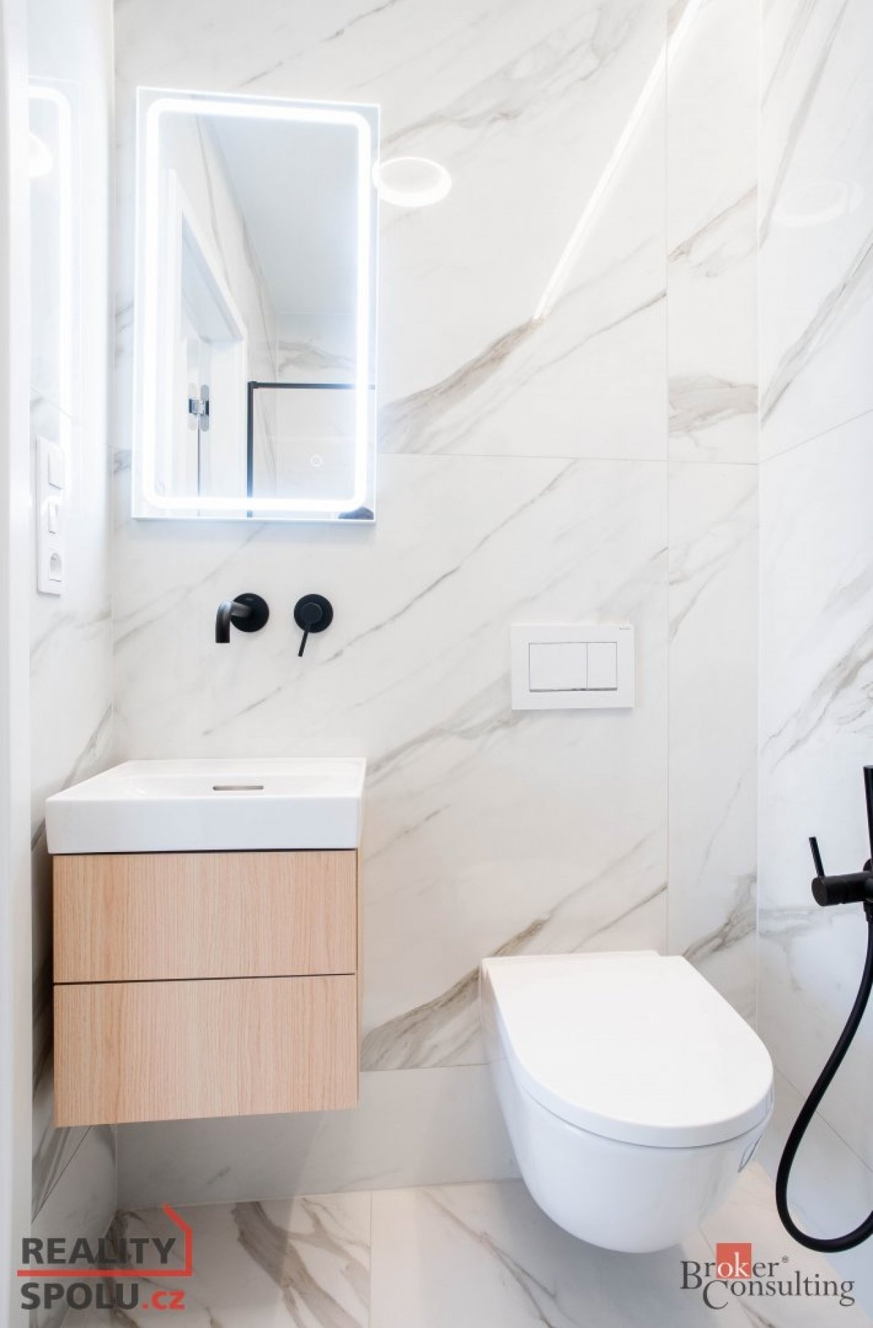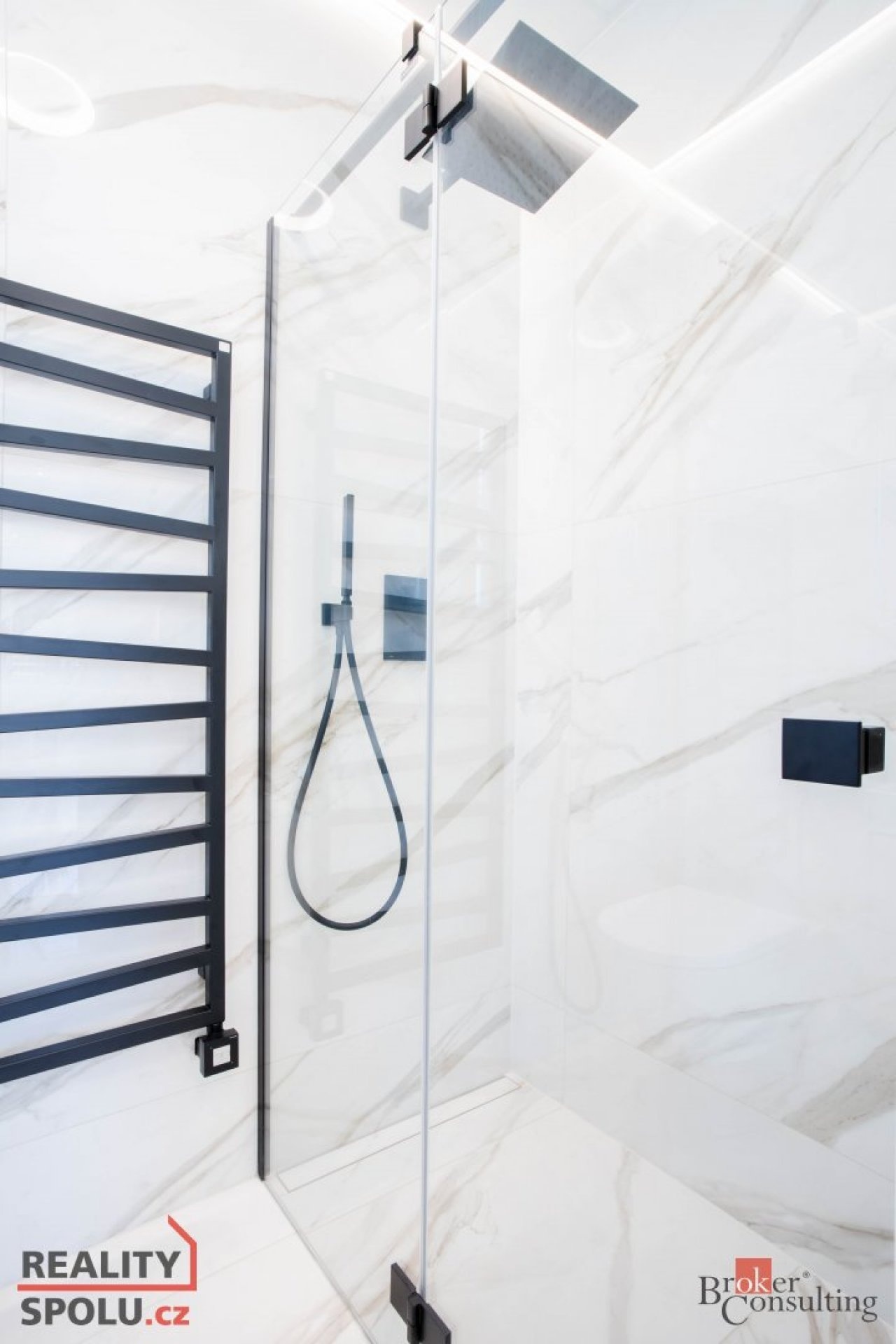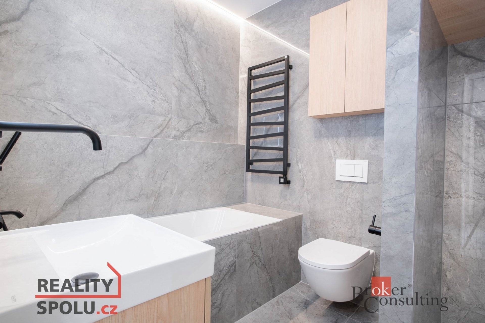 V bytě se nacházejí dvě designové koupelny – jedna vybavená prostornou vanou a toaletou a druhá se sprchovým koutem a taktéž s toaletou. Elegantní chodba s efektním kulatým zrcadlem dotváří luxusní atmosféru celého interiéru a poskytuje dostatek prostoru a úložných možností.