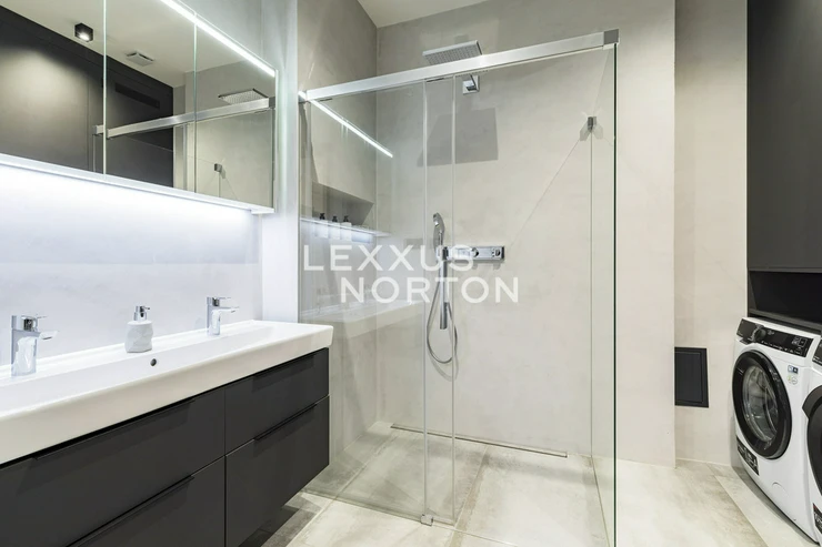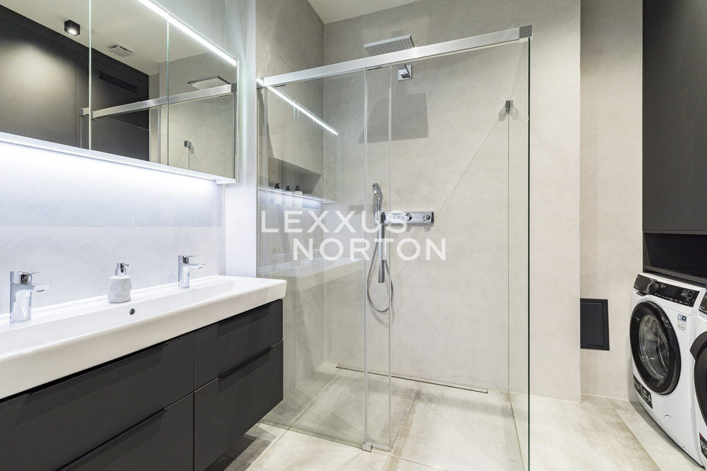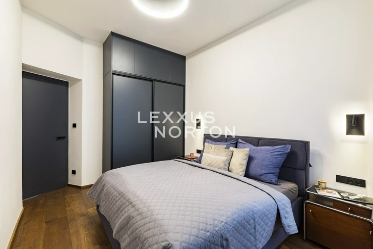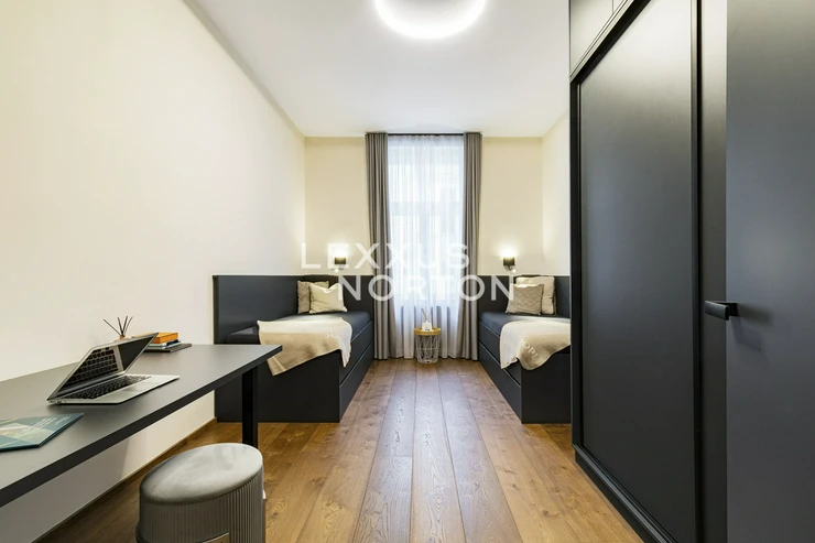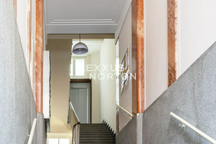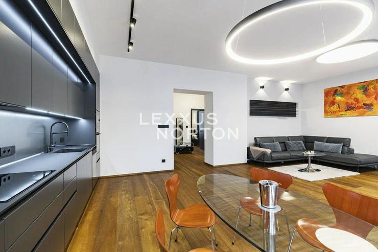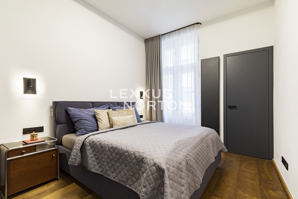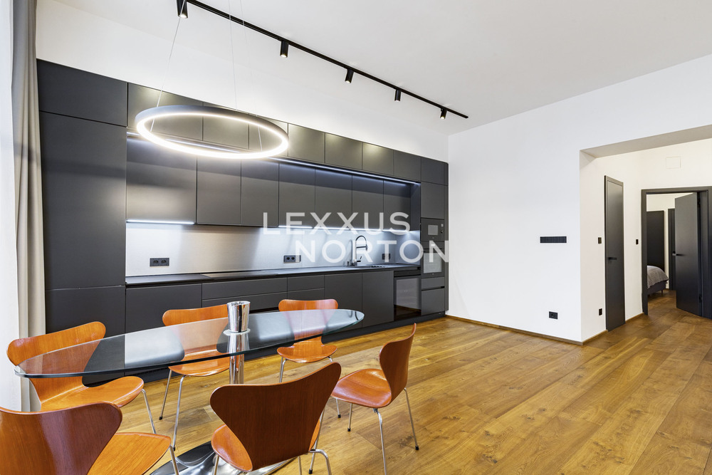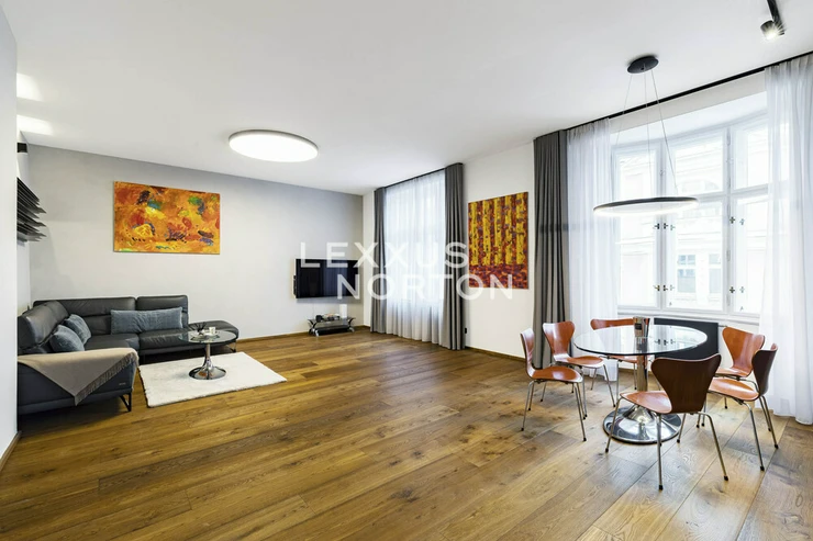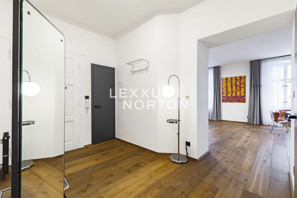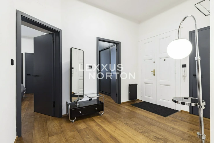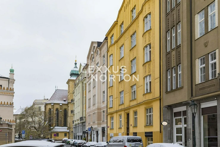 We are offering for sale a spacious two-bedroom apartment with an area of almost 94 m² on the fifth floor of an Art Nouveau building with an elevator. The property has undergone a complete renovation and offers a generous living room connected to the kitchen and dining room, two bedrooms, a bathroom, a separate toilet, a storage room, and an entrance hall. The main living area faces east onto the street with a view of the Spanish Synagogue, while the bedrooms face west onto a quiet courtyard, with the smaller of the two bedrooms having access to a balcony.The entire apartment has undergone a high-quality renovation with an emphasis on modern design and functionality. The floors are made of solid oak parquet, and the rooms are fitted with elegant flush doors with designer black handles that harmonize with the dark radiators. The kitchen in a matte anthracite finish is equipped with built-in AEG appliances. The stylish bathroom offers a spacious walk-in shower, double sink with backlit mirror and a closet with a washing machine and a dryer. Heating is provided by a Buderus gas boiler, and the windows are original wooden casement windows.The apartment is located in the prestigious Josefov district, on a quiet side street parallel to the luxurious Pařížská Street, just a few steps from Old Town Square. This historic location offers a unique atmosphere with rich cultural experiences – in the immediate vicinity you will find the Spanish Synagogue, Rudolfinum, St. Agnes Convent with its historic gardens, galleries, concert halls and a wide range of renowned restaurants and cafes. There is also a full range of civic amenities, including primary and secondary schools, doctors' offices, banks, and high-quality shops. You can relax on the peaceful Alsovo nabrezi with a view of the Vltava River or in the nearby Letenske sady park. Transport links are excellent – the Staromestska metro station is just a few minutes' walk away, and tram stops in the vicinity provide quick connections to all parts of Prague.